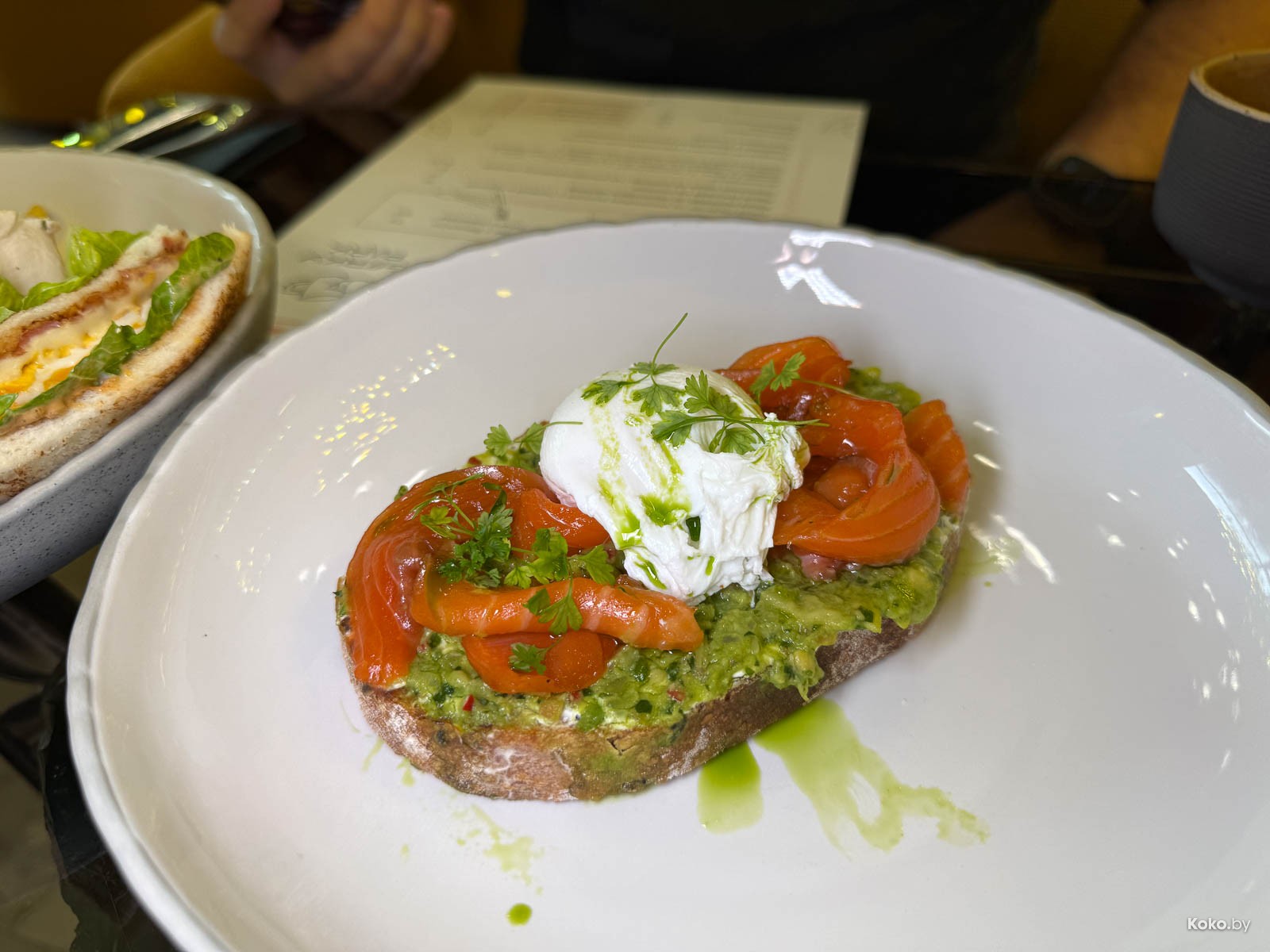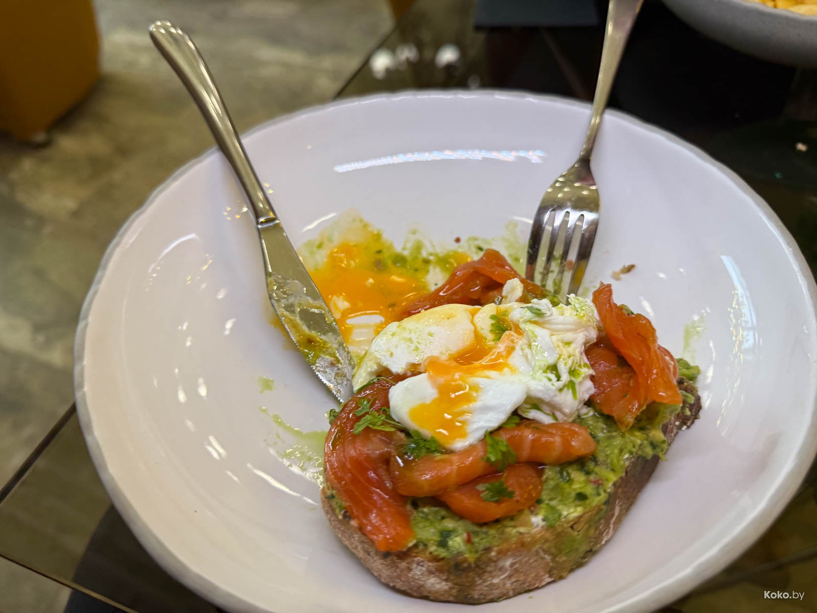 1. В салатной тарелке ломтик зернового хлеба с творожным сыром, пряным гуакамоле и бодрым лососем своего соления. Пашотом в яйцо попали, чуть больше размер хлеба, и 17р вообще не жалко. Вкусно.