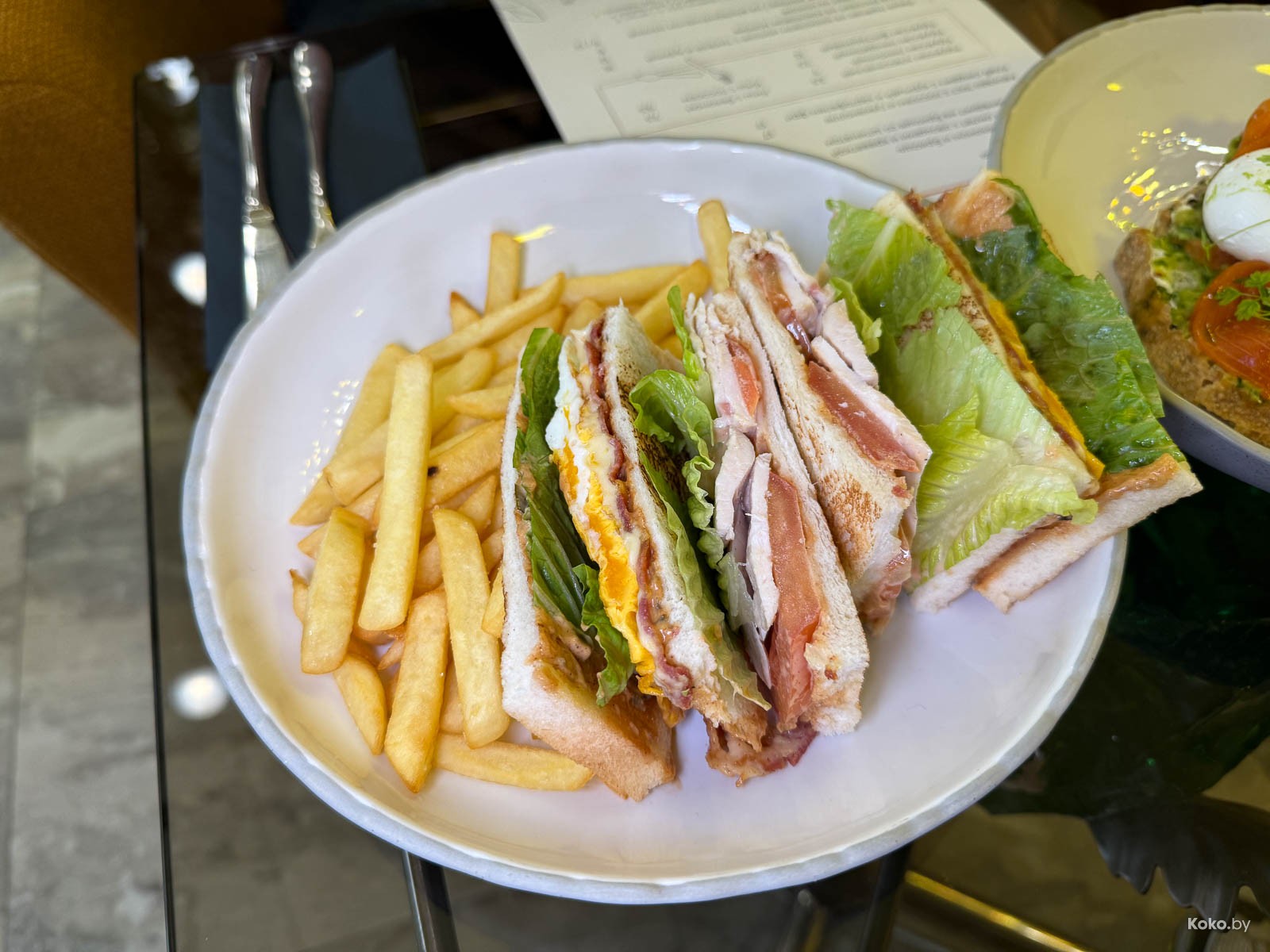 2. В такой же тарелке видно сытный клубный сэндвич с золотистым фри за 17р. Сделать чуть дороже, но чтобы с соусом для картошки на выбор.