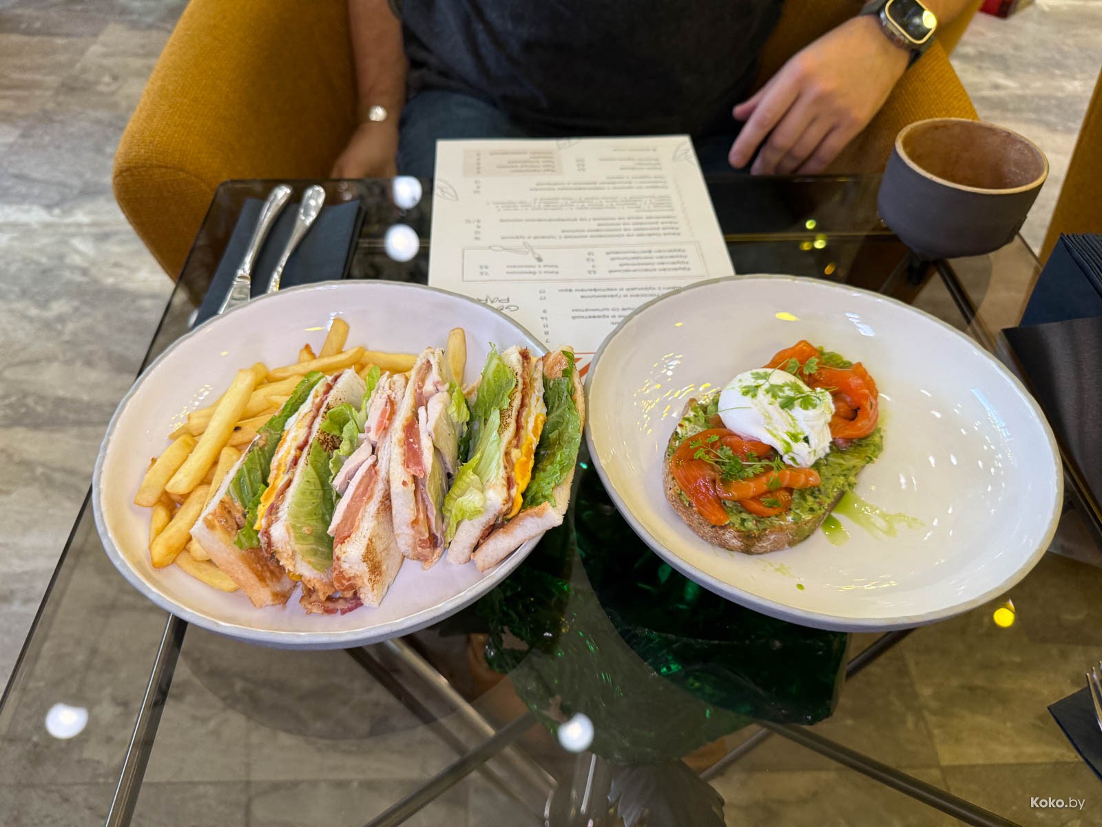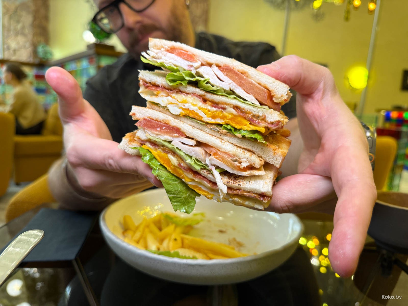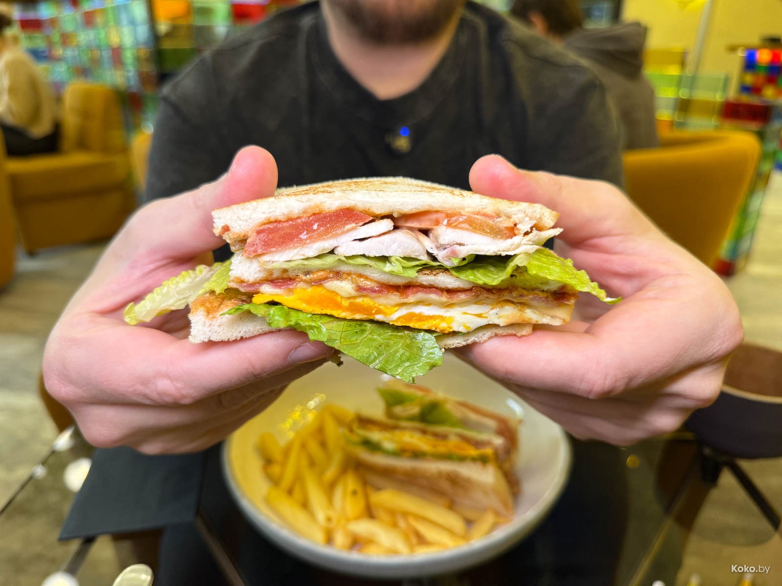У нежного тостового тоста срезали борта, промазали соусом, добавили курочку с гриля, сыр, листья салата, помидор, яичницу и хрустящий бекон. Идеально. Напомню про подборку «Где лучший клаб-сэндвич».