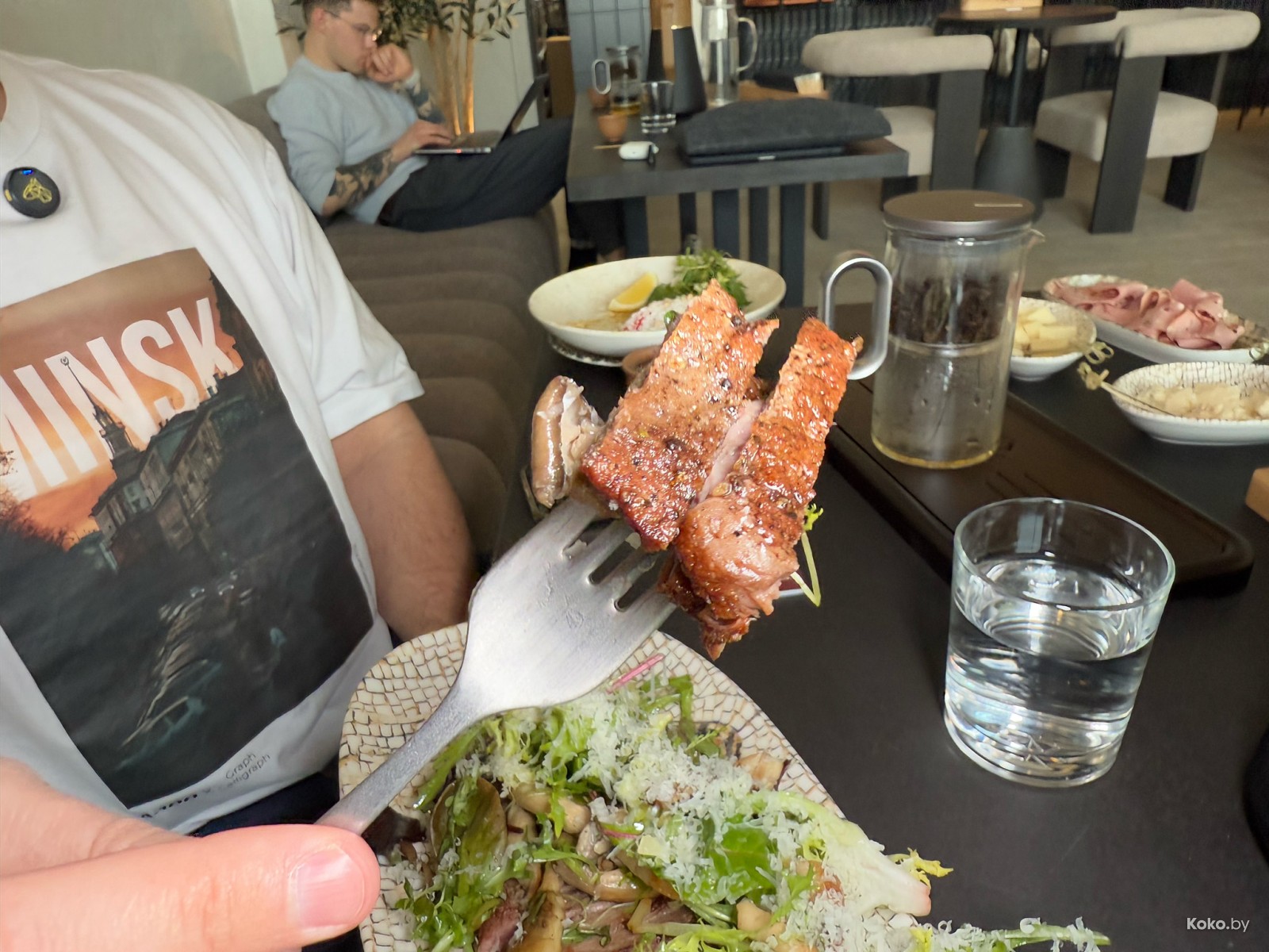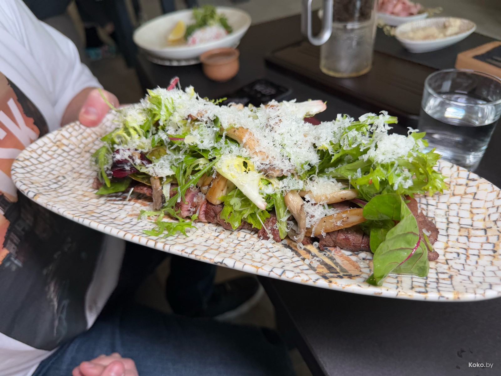 3. Минут через двадцать вынесли стейк по-итальянски - это тальята из говядины с вешенками за 48р под салатом и много пармезана.
