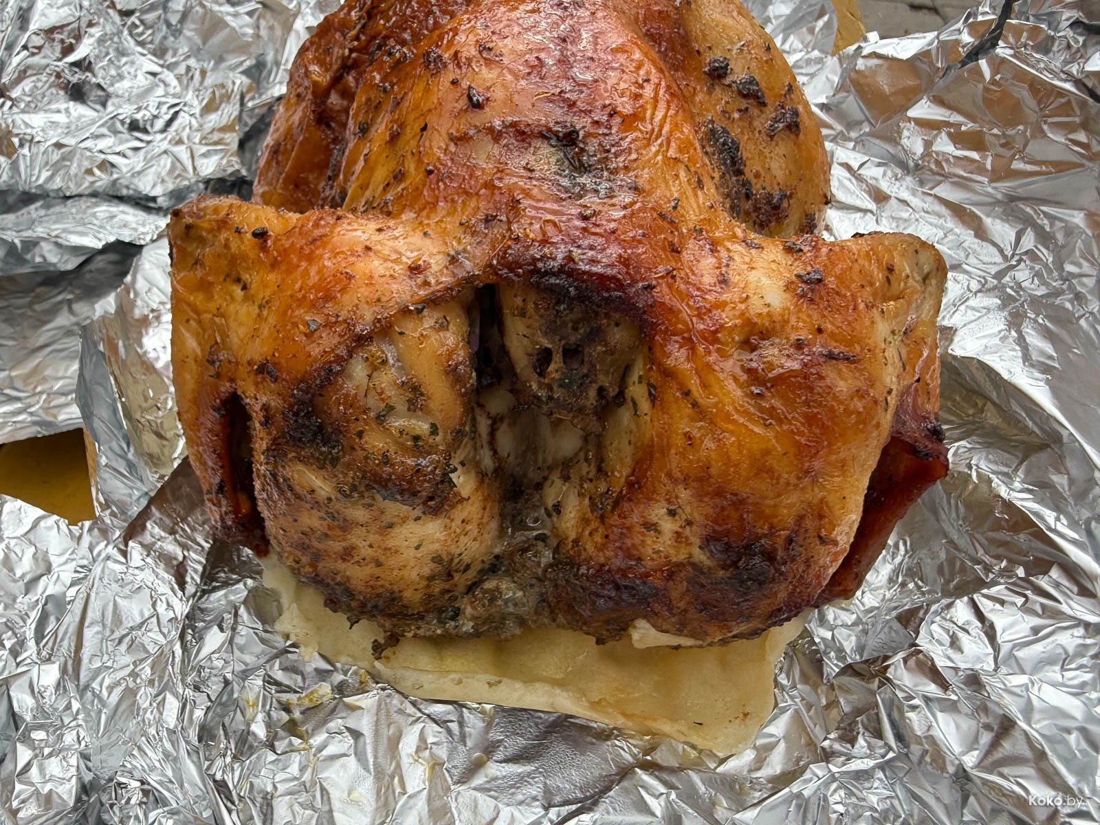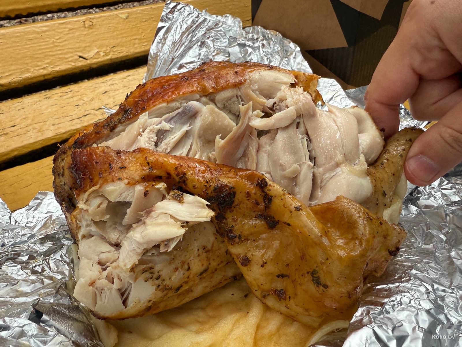 Курка мясистая, мясо сочное, хорошо пропеклось, корочка могла быть более хрустящая, так, чтобы хрустела на зубах вкусом детства.