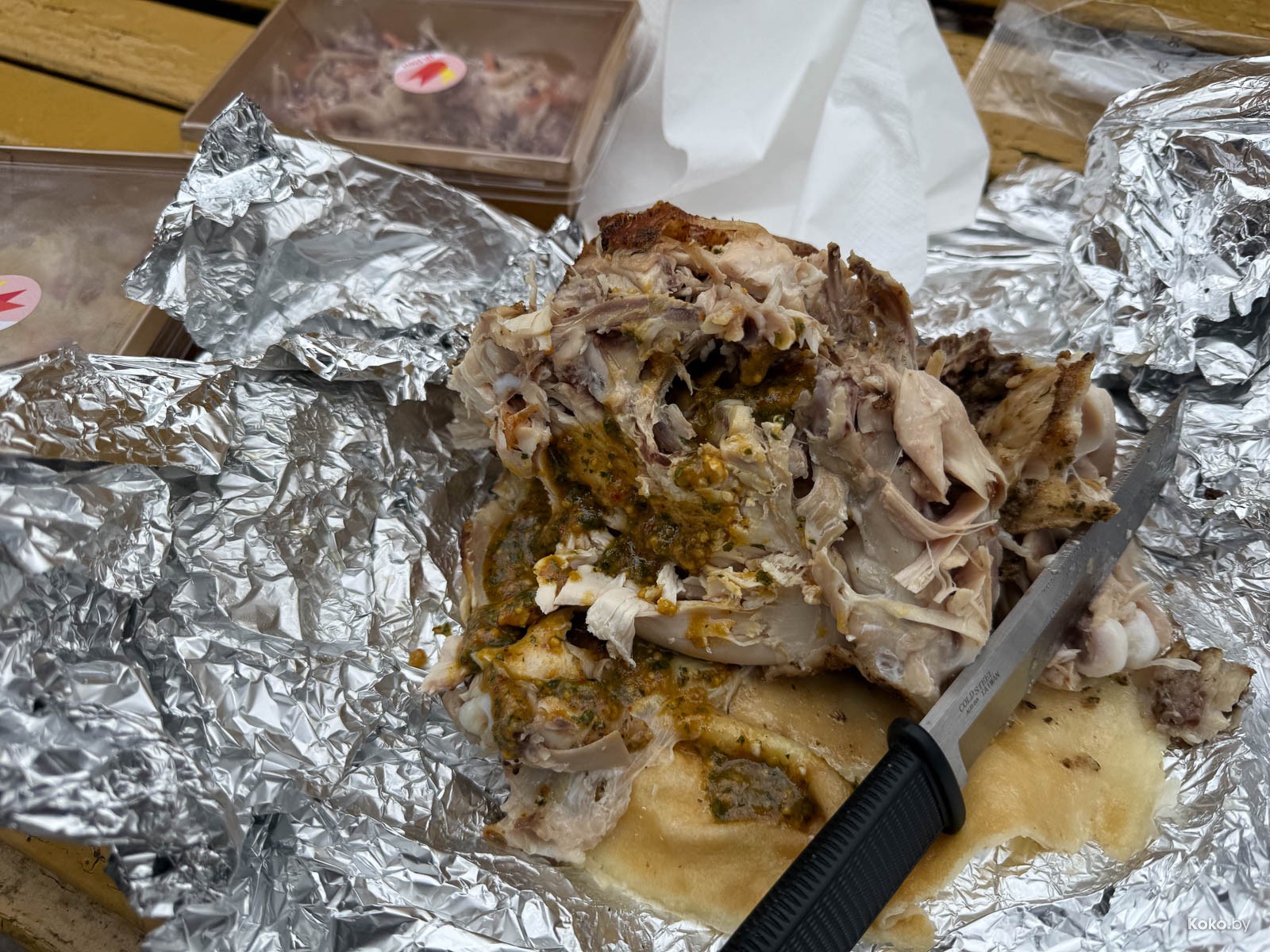 1. Курица плотно обёрнута в фольгу, под неё, как пелёнку, зачем-то подложили вспотевший от конденсата блин. Лучше бы рядом лаваш.