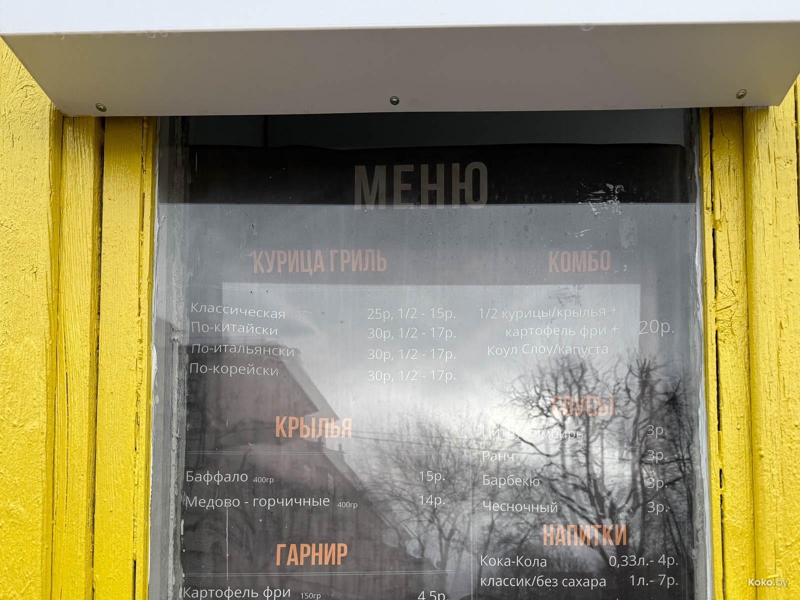 В меню четыре маринада курей, но готовят лишь один, классика, из-за никакого спроса на экзотику. Целая тушка - 25р, половинка - 15р, кроме этого крылья, салаты, картошка и запить. Предзаказываем, чтобы забрать через полтора часа, за студенческий набор из копилки вытряхнул 36,50р.