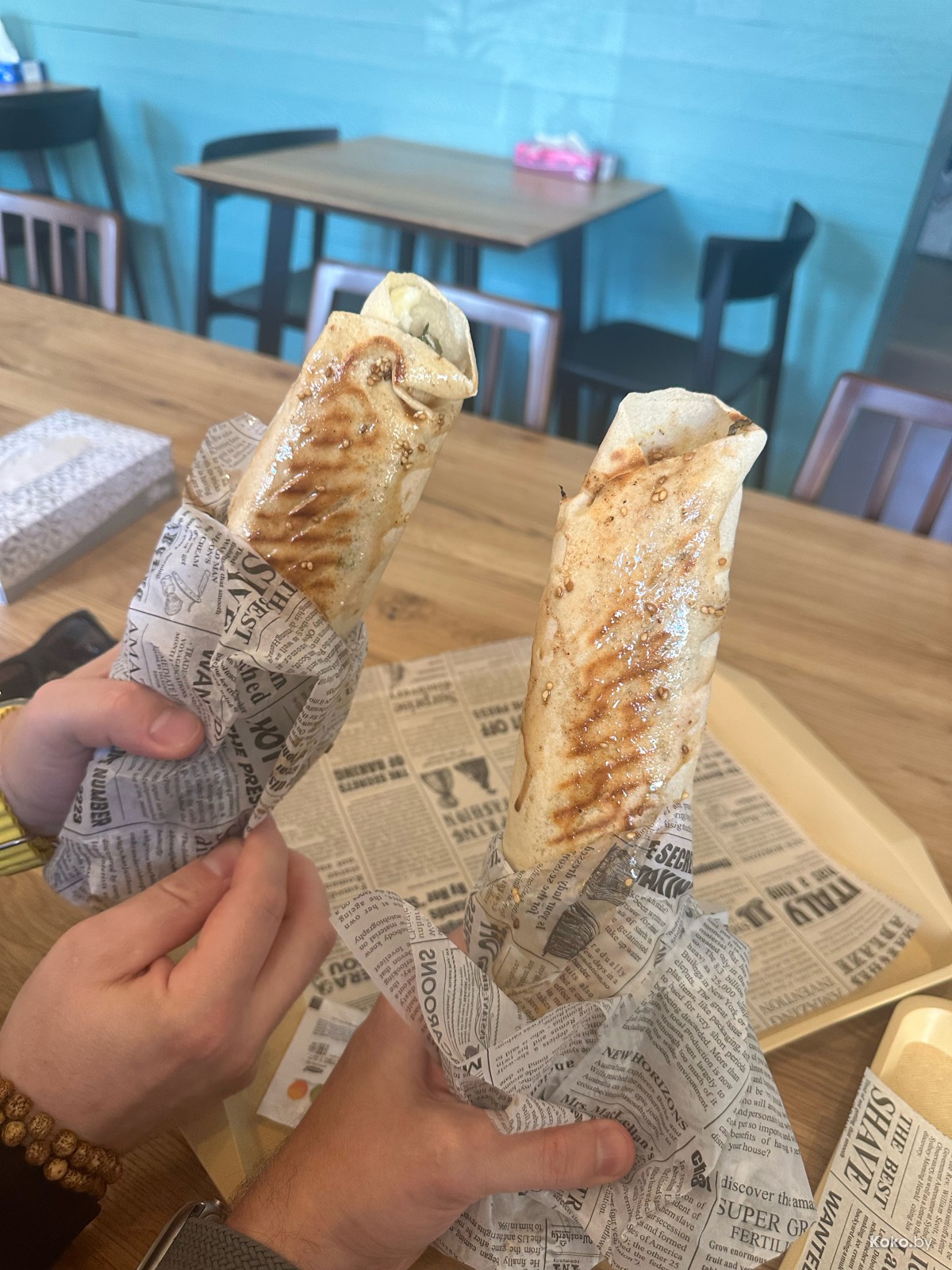1. Скручена профессионально в белый дешёвый лаваш. Почему не закупить для неё пышных пит, с учётом конской цены? Было бы вкуснее.