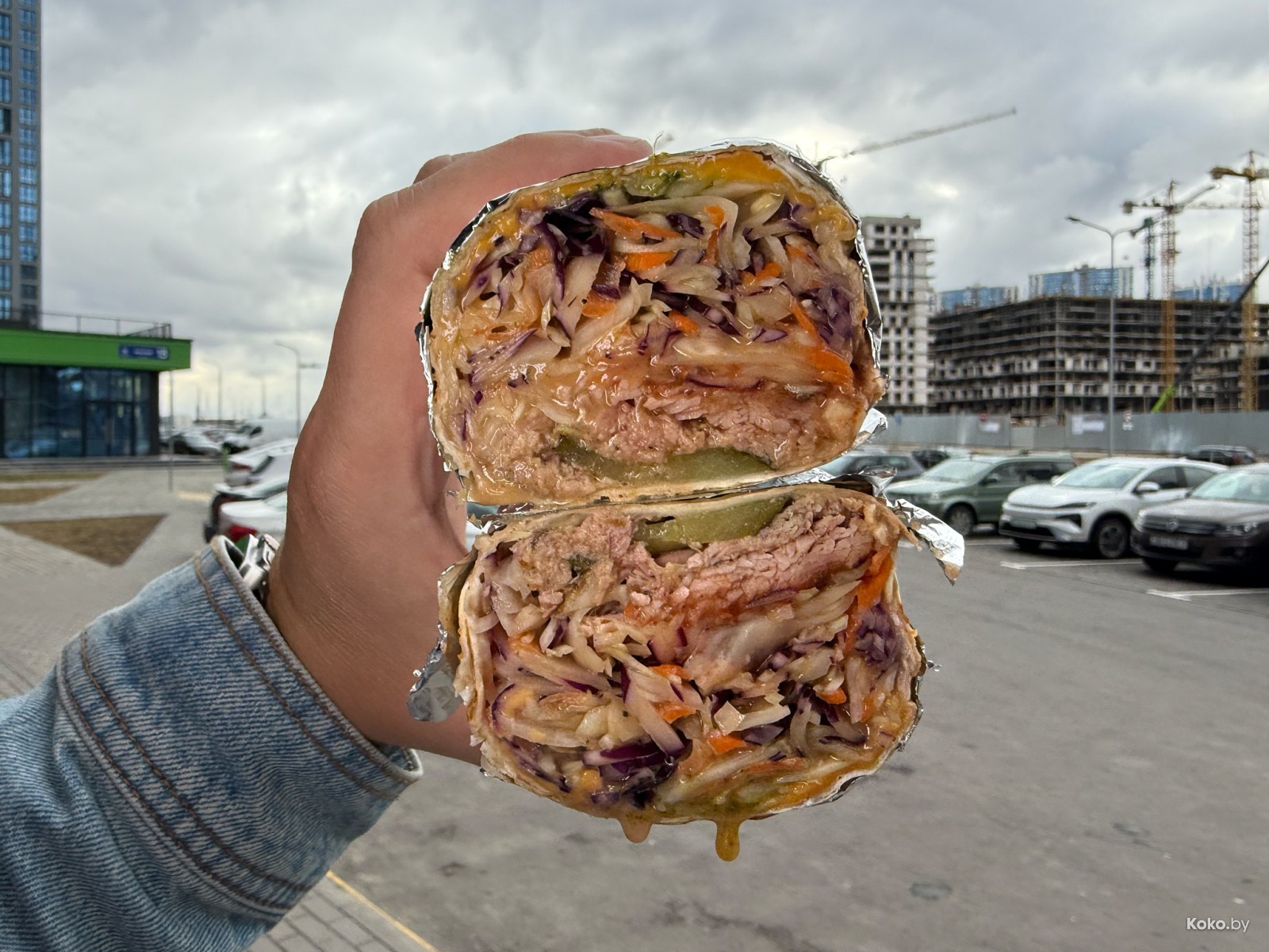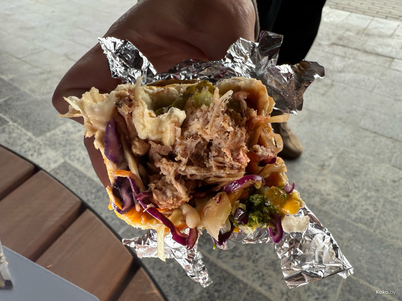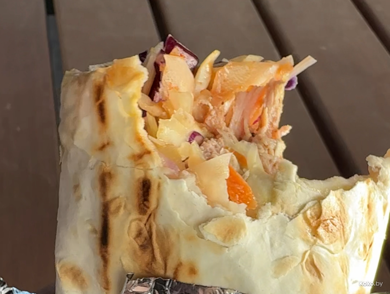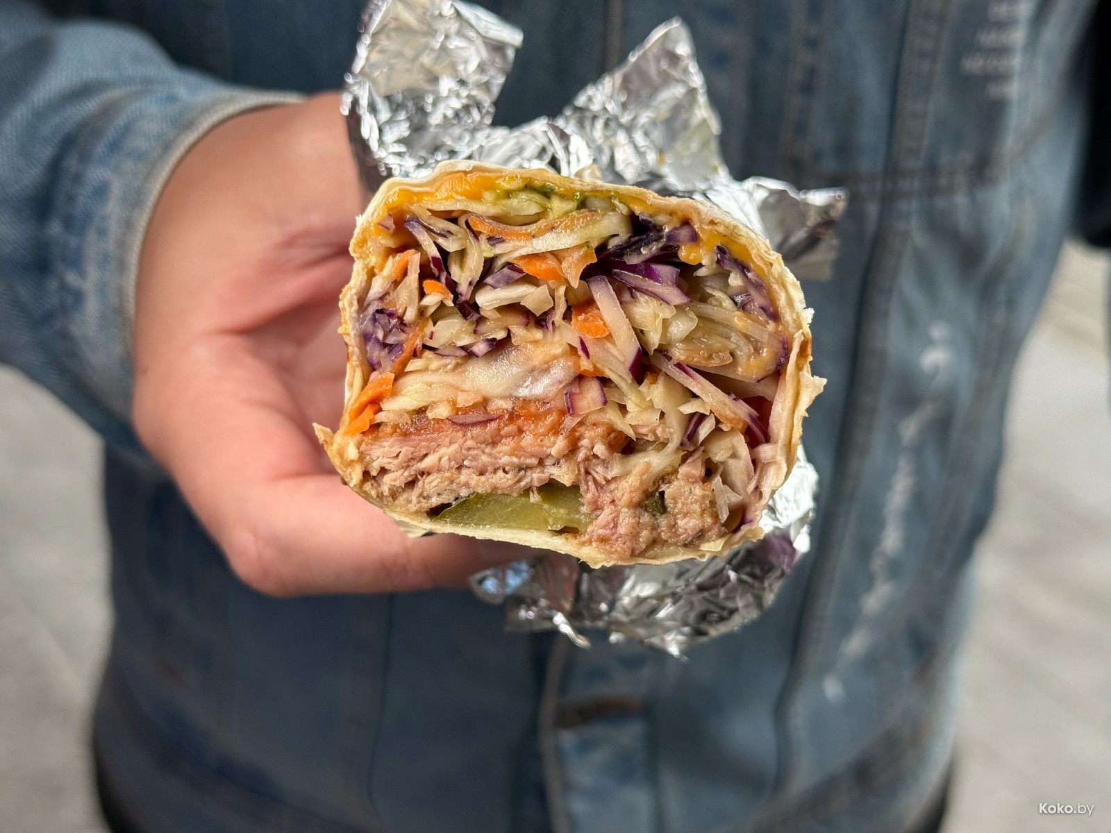 Внутри мягкая разноцветная капуста, филе солёного огурчика, соусы, и честно напихали сочного мяса индейки. Судя по растушеннности в мясную тушёнку и ноткам дыма, индейку долго коптили - это фишка.