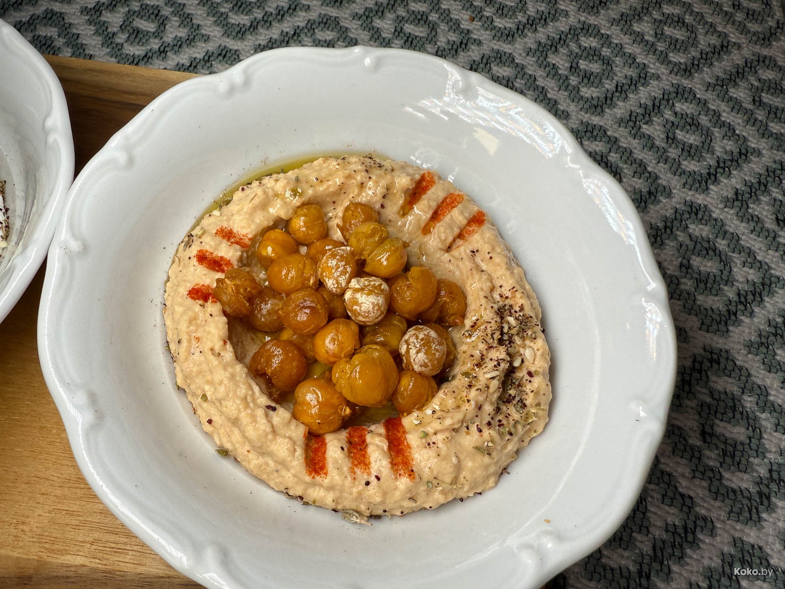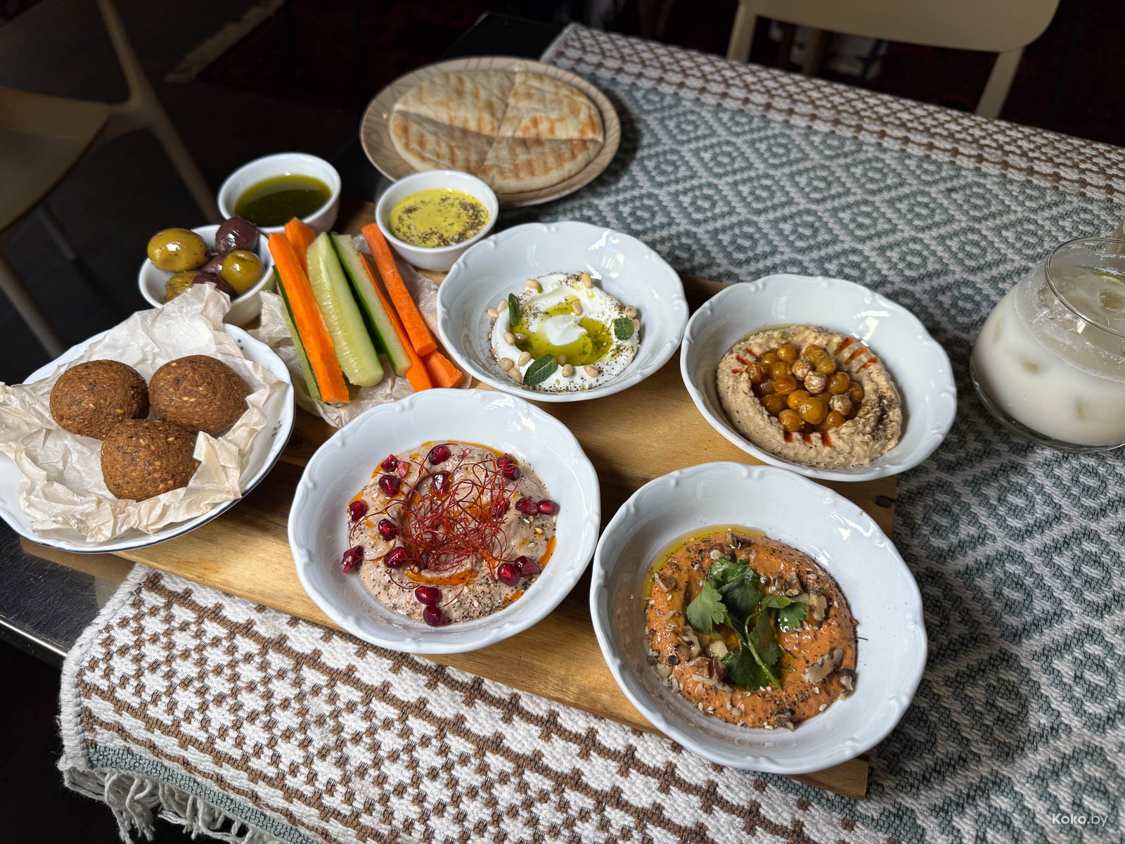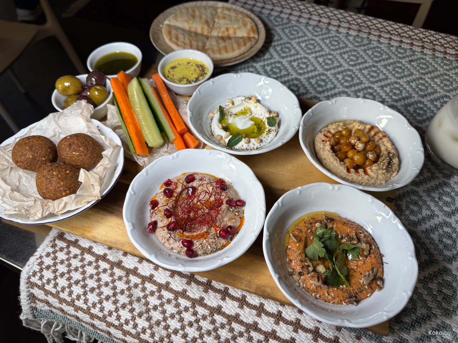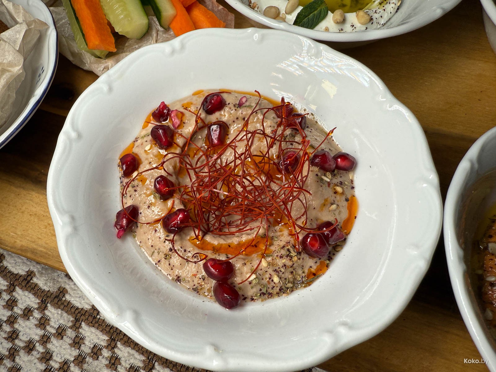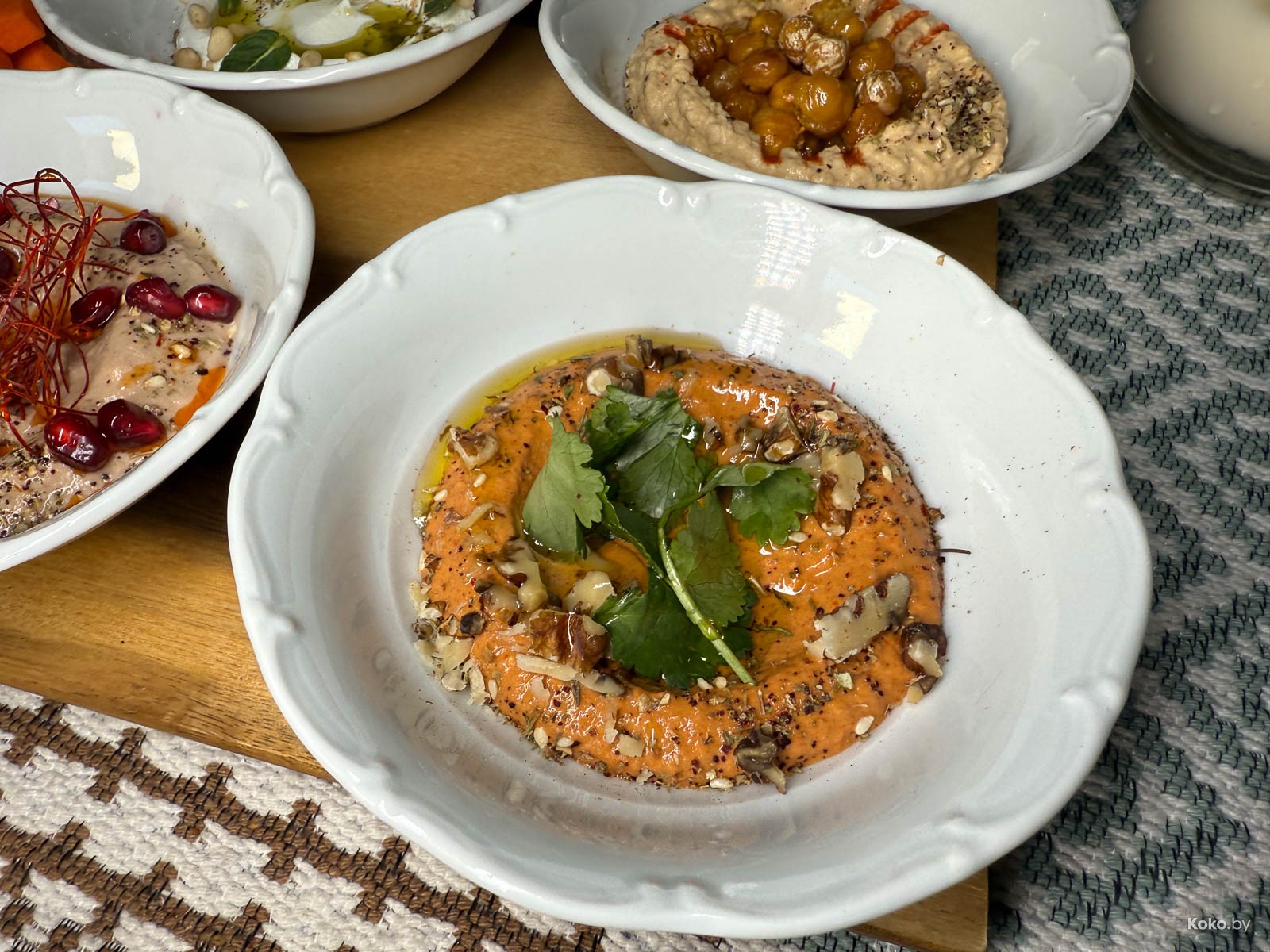 Набор переработанных продуктов в блюде, как палитра художника. Вкуснейший взбитый хумус, соус типа ромеско из печёных перцев, паста из баклажанов и кроличья нарезка, сет за 26р на уверенные 8 кокобаев.