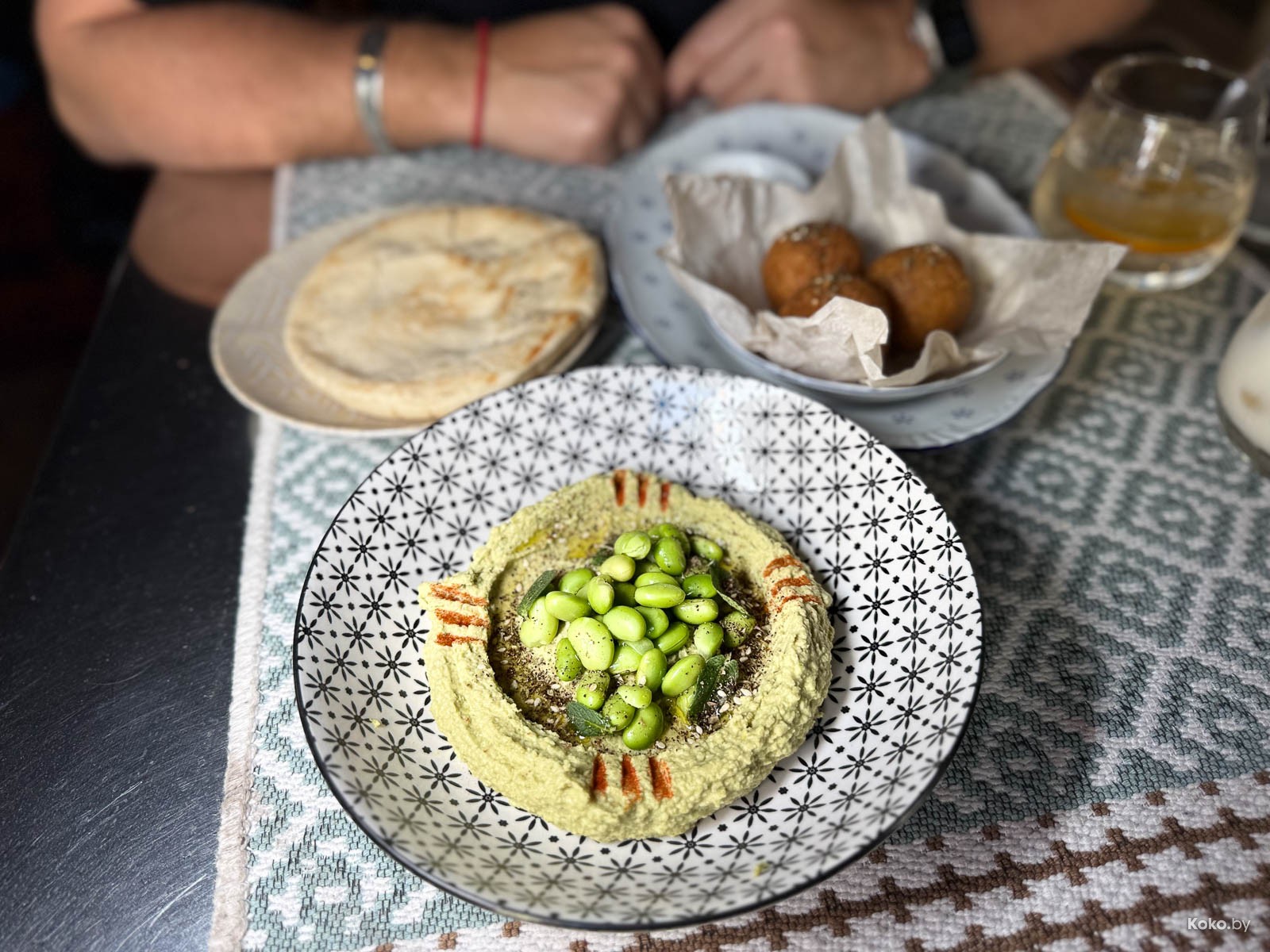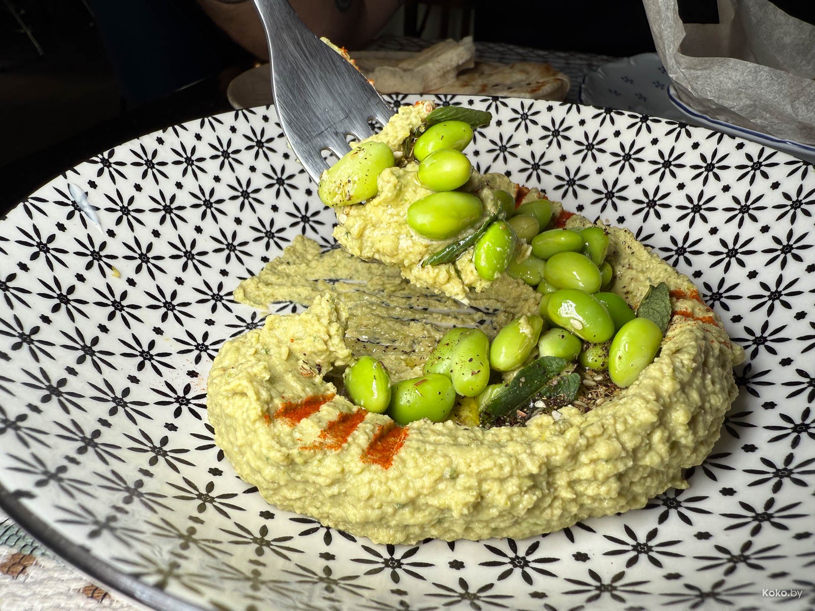 2. Первым у нас случился зелёный из зелёных травяной хумус с бобами адамами и мятой для начала погружения в мир без мяса и боли.