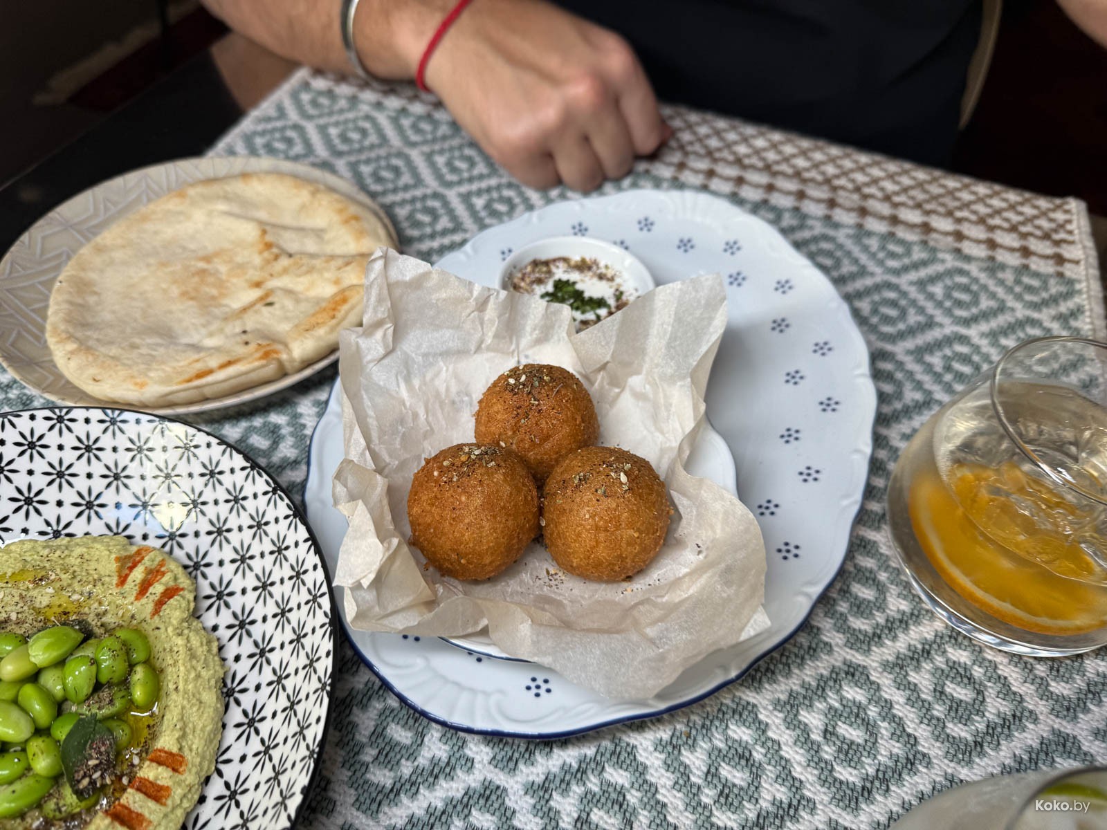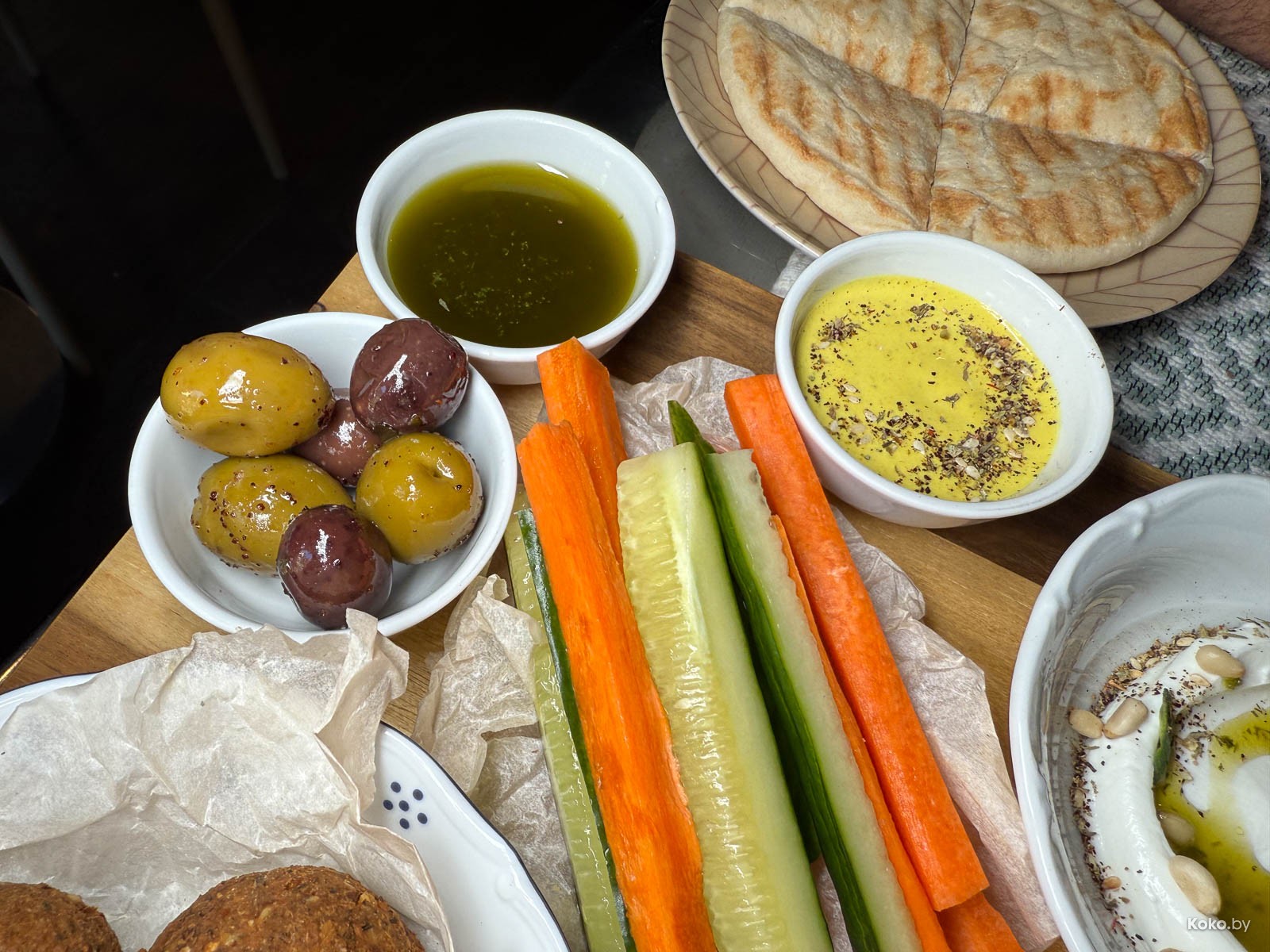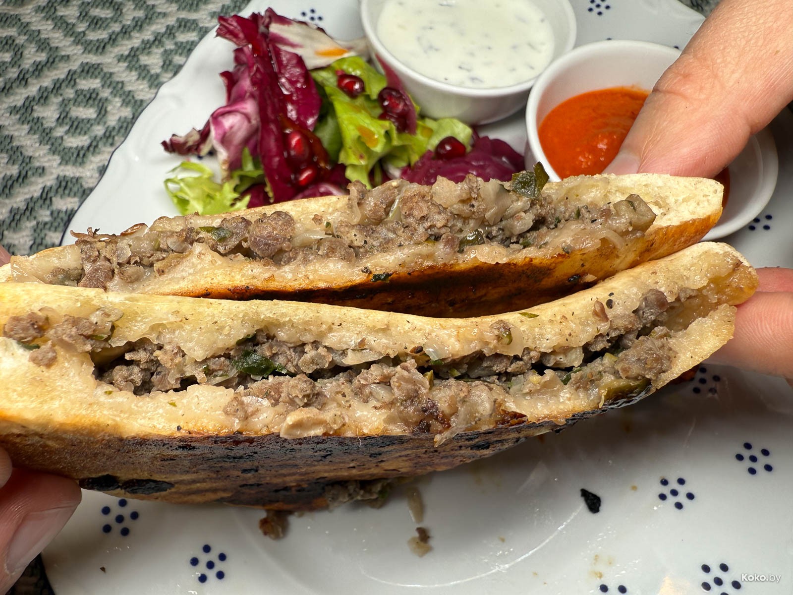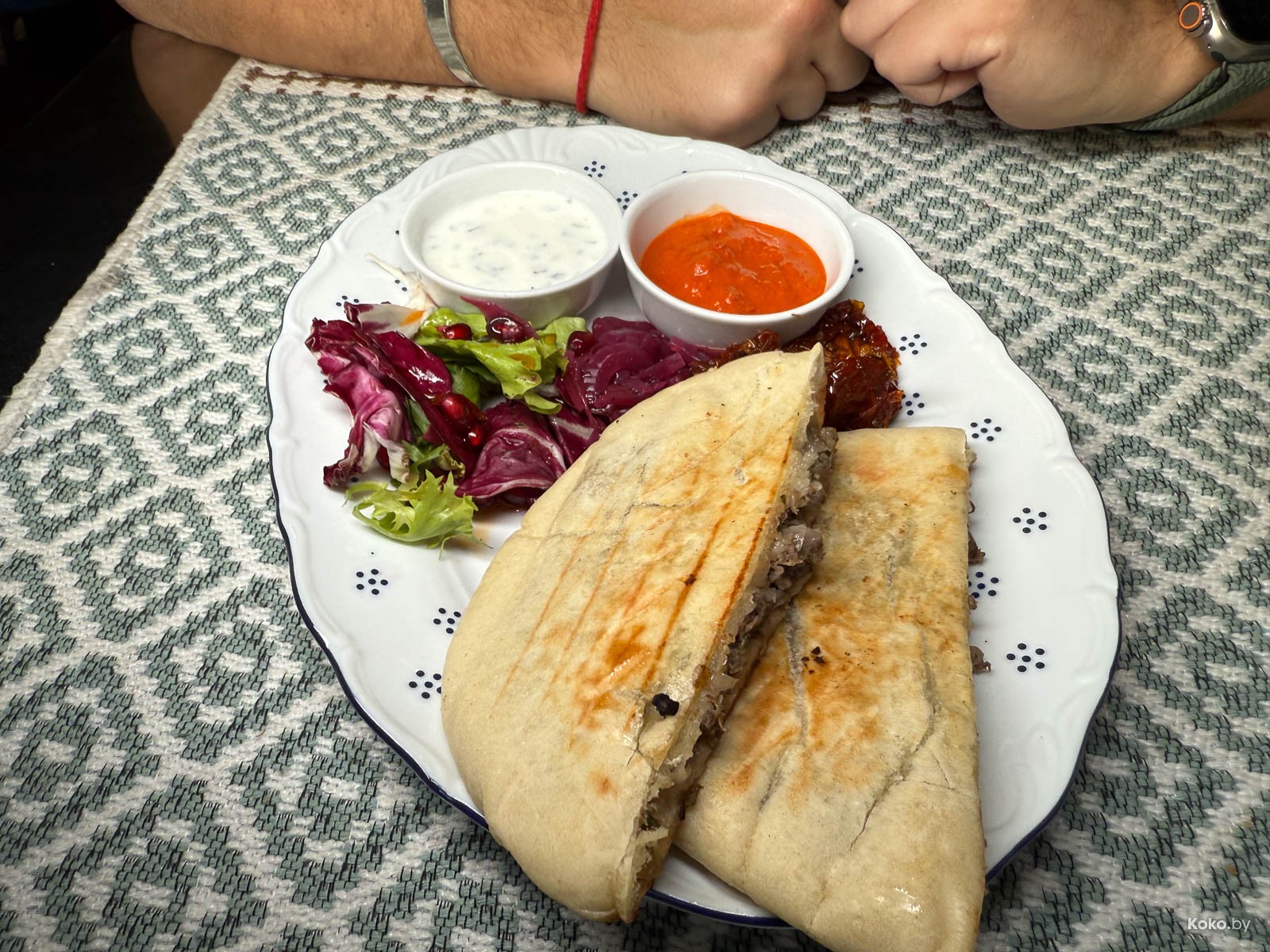 4. Звучит, как планета из Дюны, но это лепёшка, наполненная овощным пряным фаршем. По ощущениям, как гречка с оливками. На гарнир салат, маринованный лук, вяленые томаты и два вида соуса.