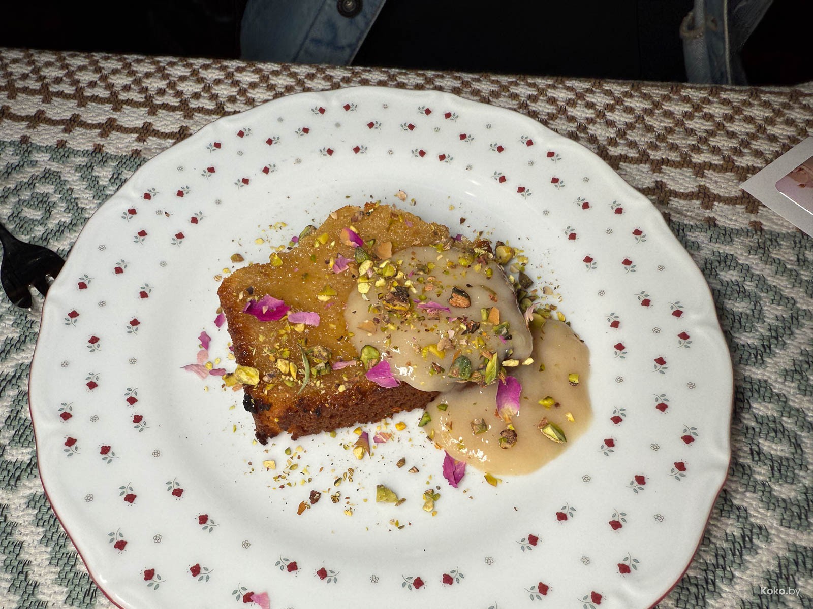 5. На десерт рискнул куском сладкого хлеба, пропитанного сиропом с апельсиновыми нотками, съедобным гербарием, битыми орешками и слизнем из кокоса. Тут могла быть шутка про белое на десерте.