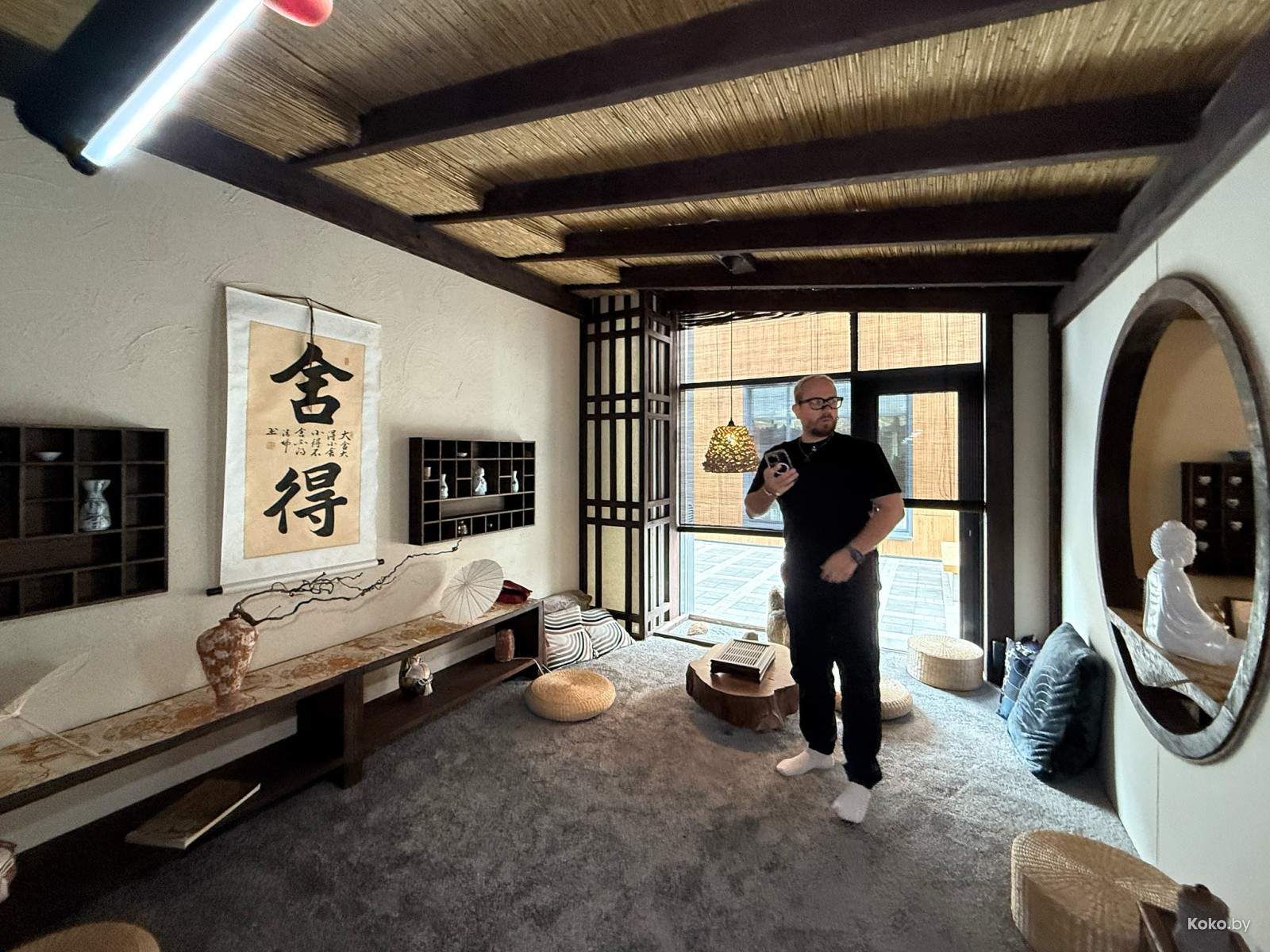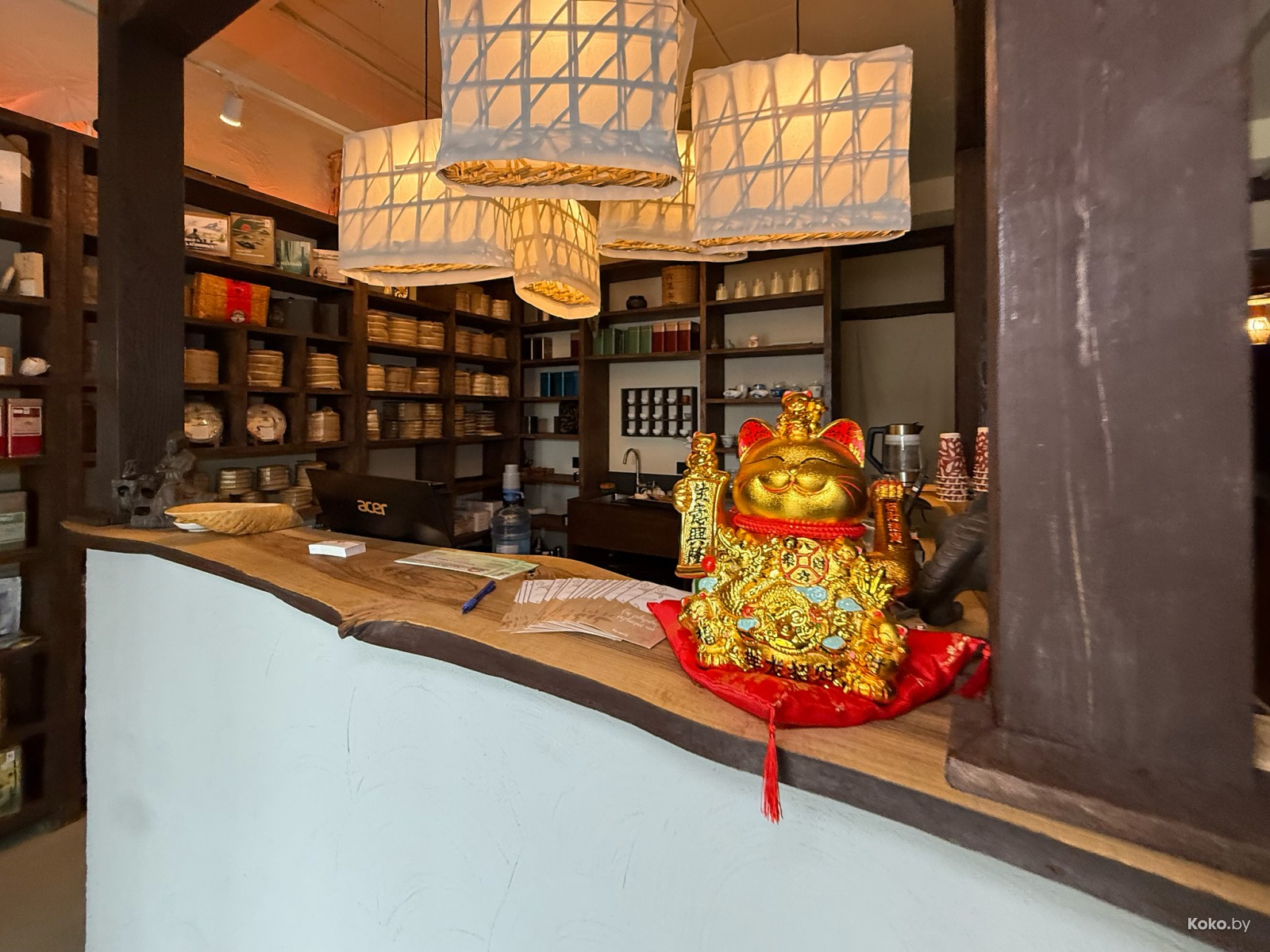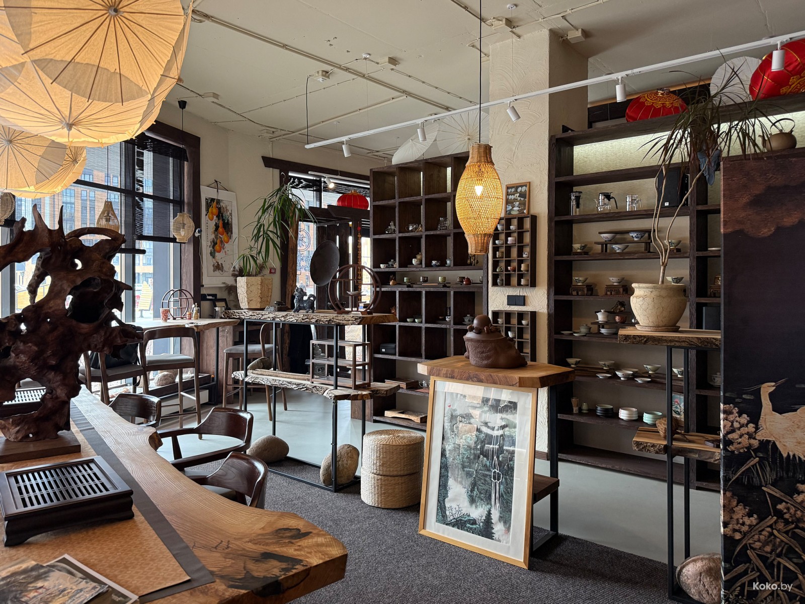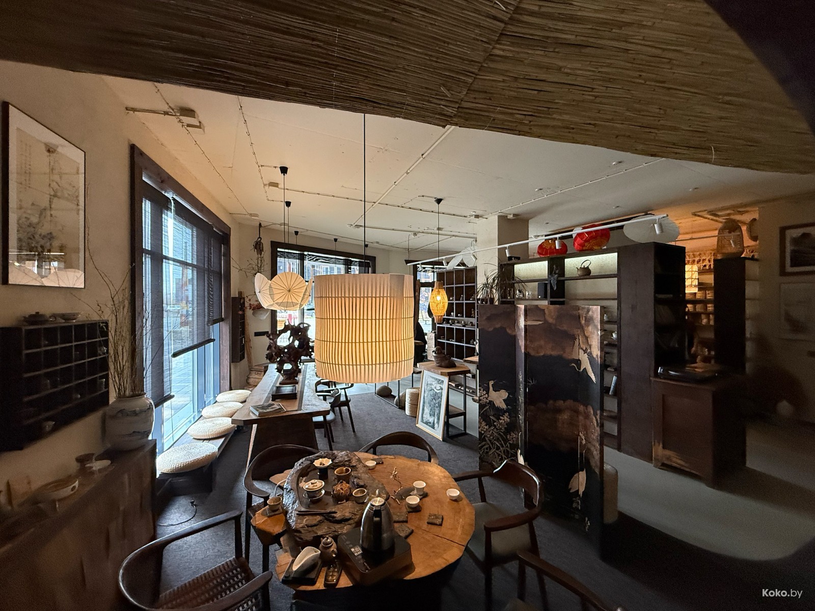 Как маленькая китайская деревня, разделённая на комнаты, чердак, зал приёма чая за шторкой и большой стол с камнем для слития заварки.