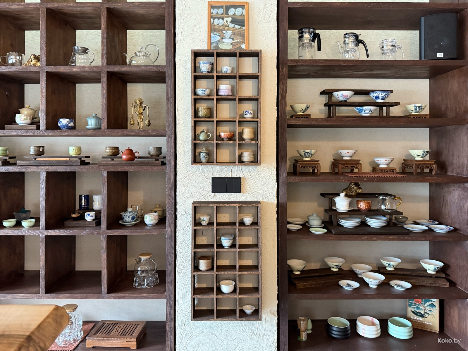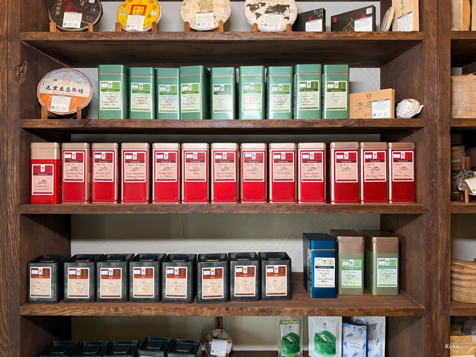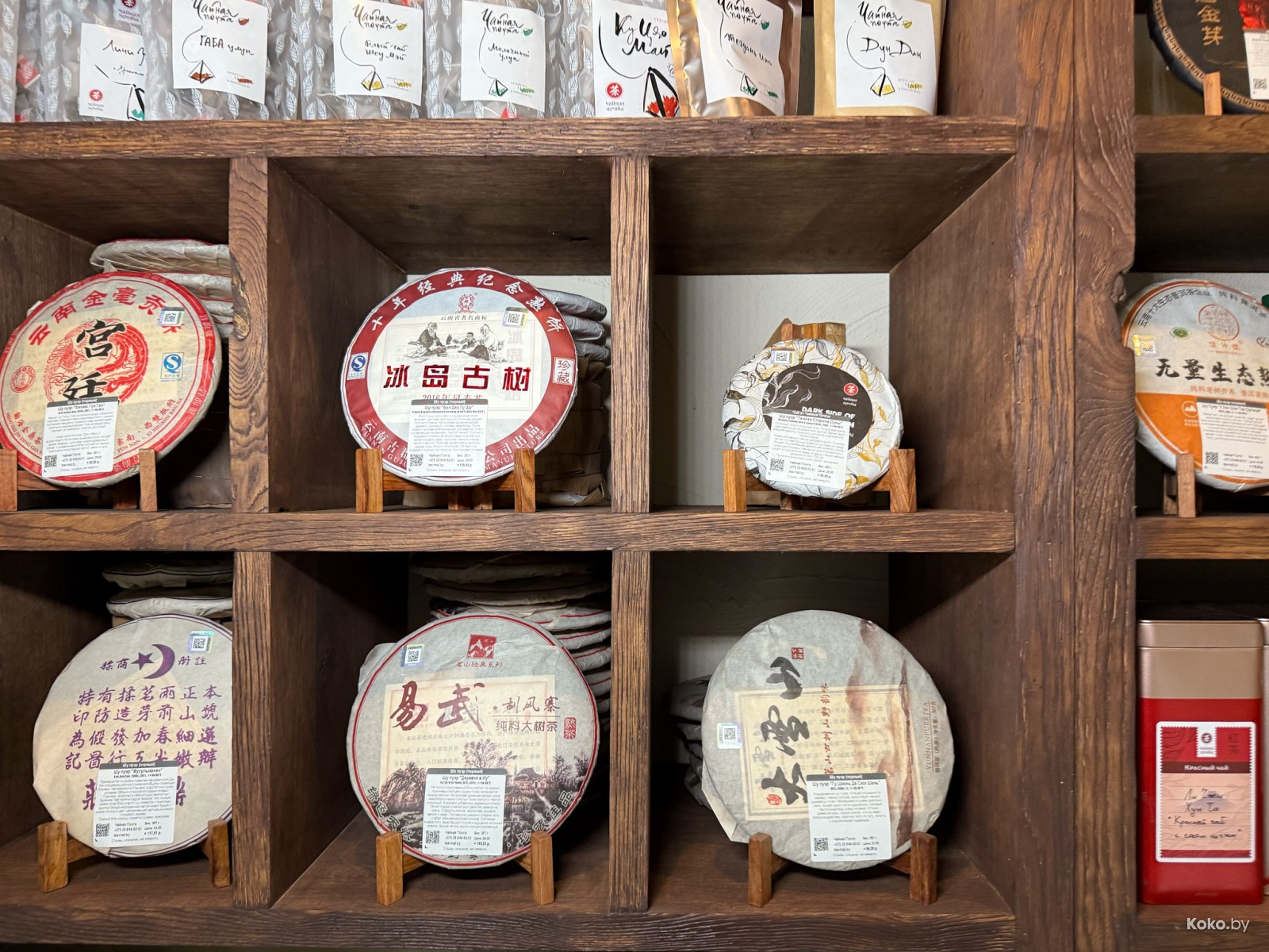 На полках разный чай, можно купить всё для приёма чая дома. Я как-то загнался, теперь на кухне имеется: чабань, глиняный чайник, гайвань, сито, чайный пруд Зелёный дракон и с десяток разного чайна чая.