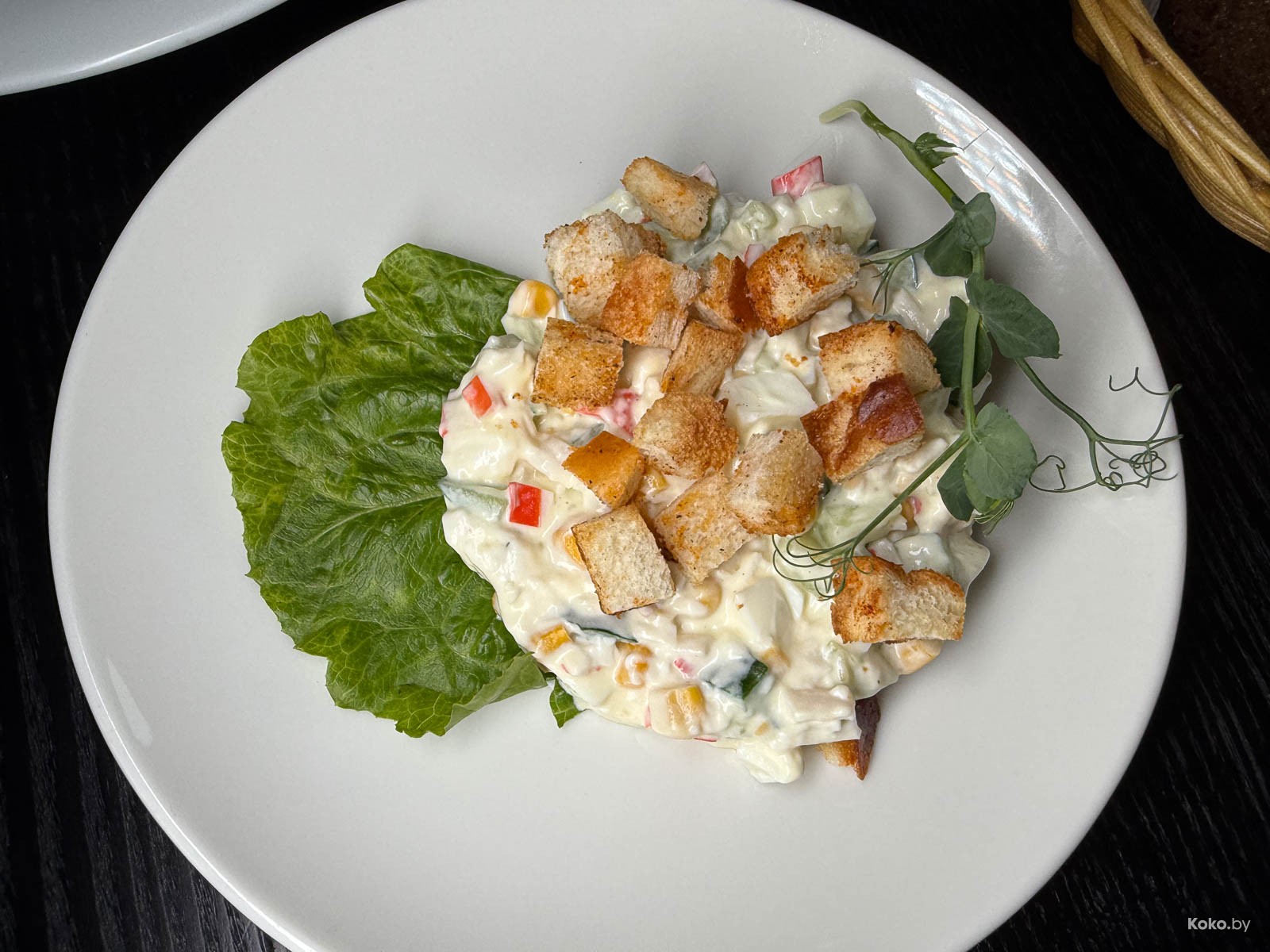 2. Новогодний салат по-цезарьски с крабовыми палочками и огурцами под мазиком. Порция столовая, свежесть сегодняшняя, вкусно.