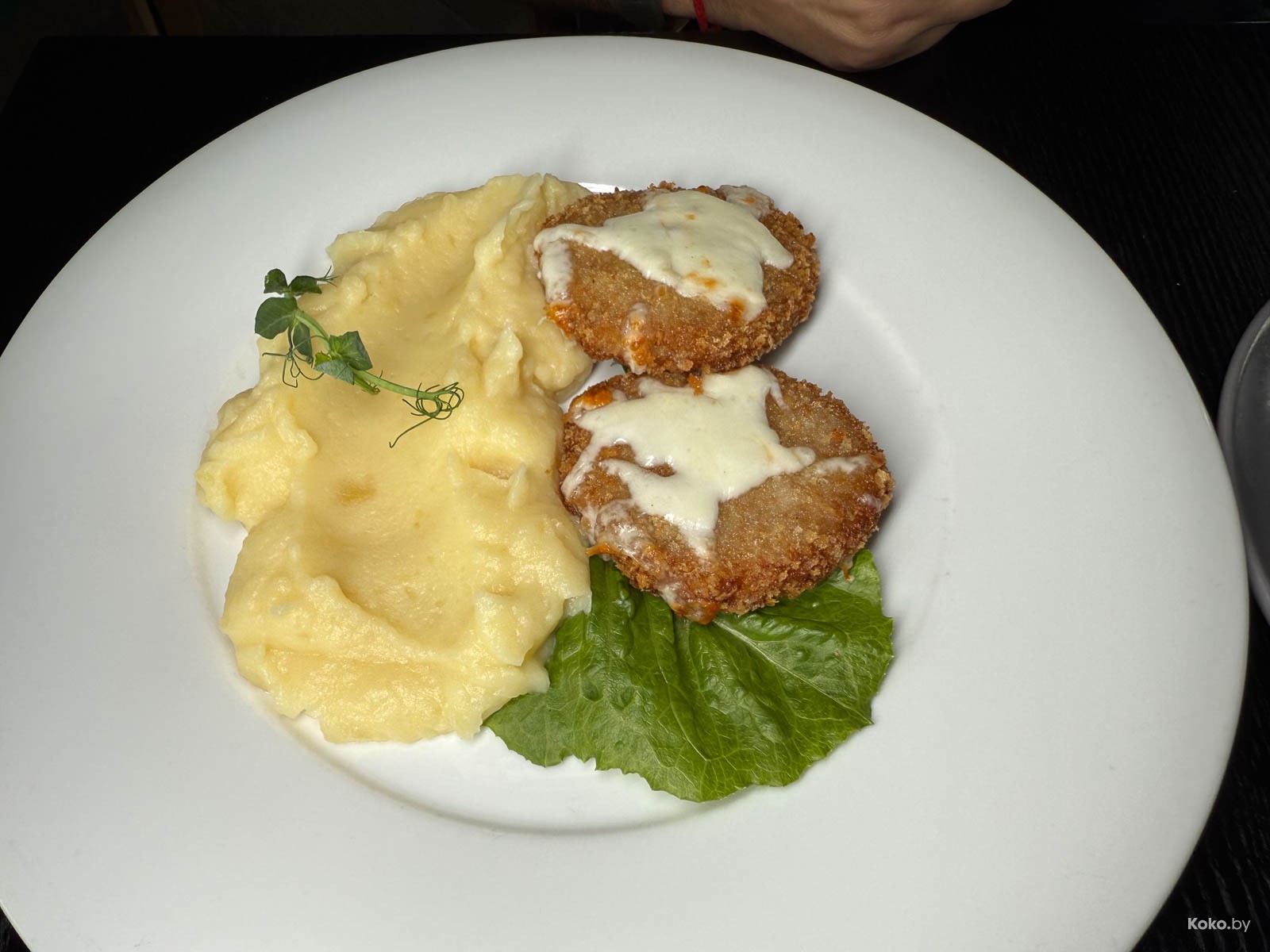3. Два биточка любительских по-французски под сыром и сливочное пюре по рецептам садиков. У них на кухне чья-то бабуля, вкусно.