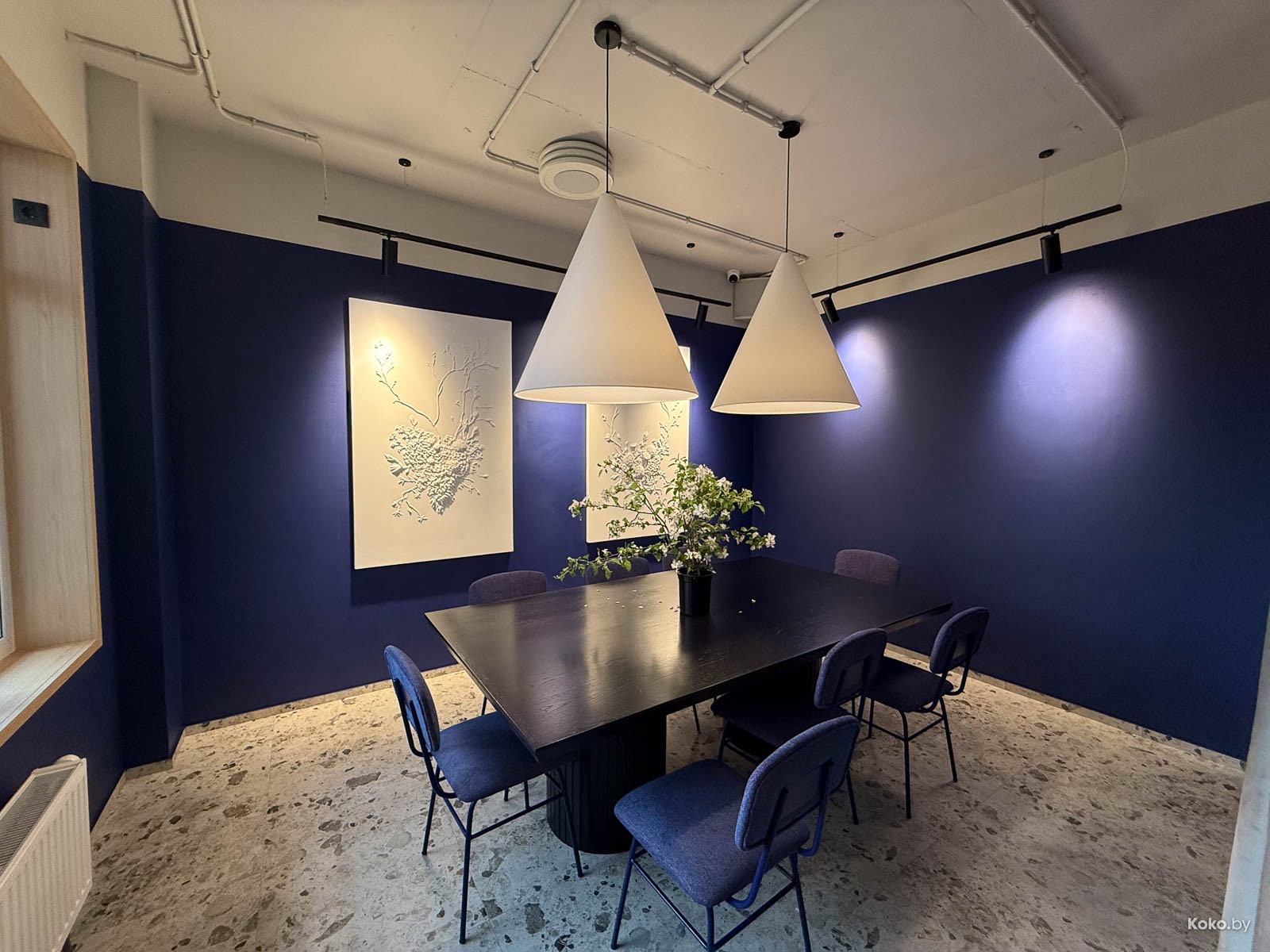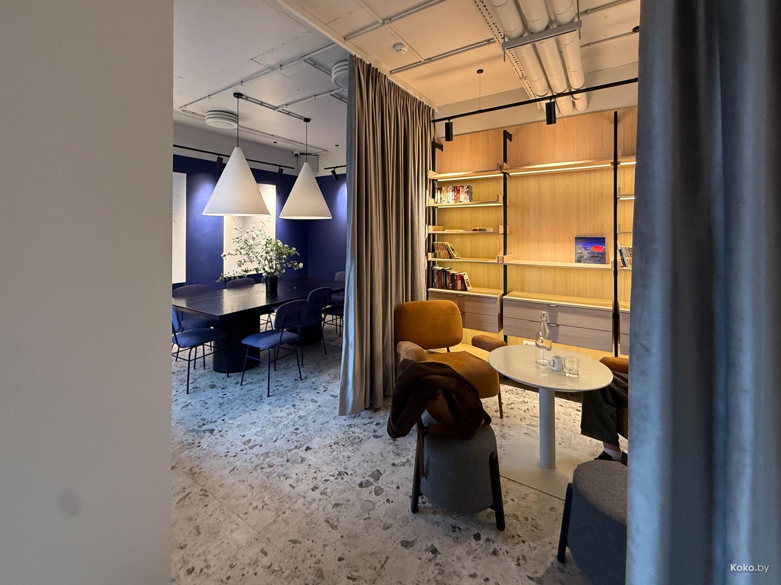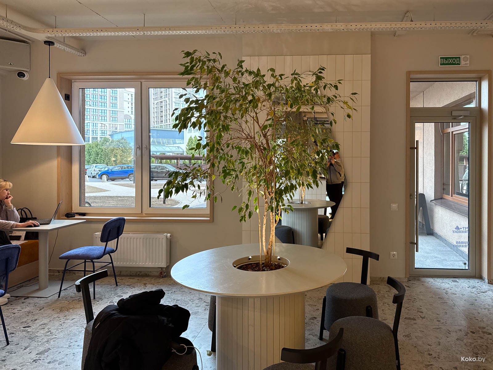 Два просторных зала, круглый стол у дерева, гостиный зал с креслами и випка за шторкой. С учётом бюджетного ремонта получилось уютно, дело в аромате свежесваренного кофе, картинах и домашней мебели.