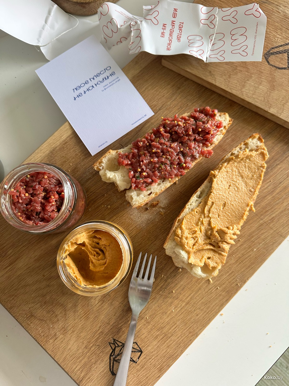 Дома провёл алхимическое испытание, соединил мройвовский хрустящий багет за 4р с тартаром и хумусом из кулинарии Ворошилова за 44р две банки. Говяжий тартар правильной рецептуры, я бы добавил чуть больше хрустящих каперсов, таки хумус в лучших традициях.