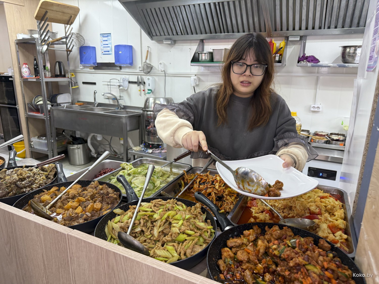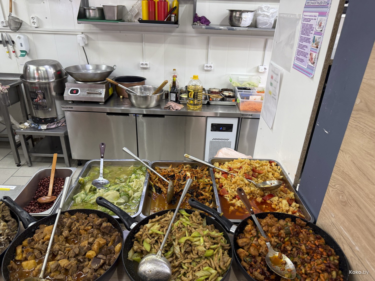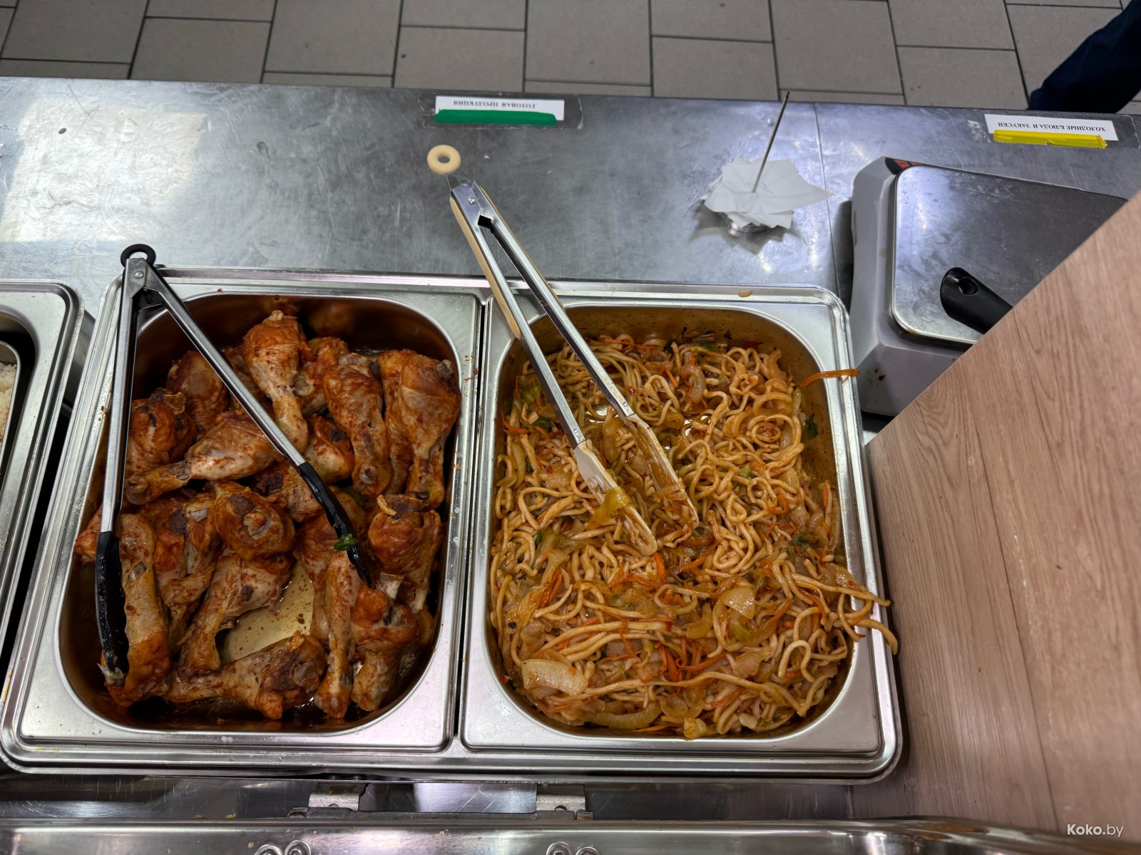 На кассе отдаём 19,90р, но в чеке 20р и направляемся к линии нагрузки еды, где на выбор разная свинина в соусах, говядина с картошкой, яйца с помидорами, куриные ноги и пёс знает что без описания рецептов.