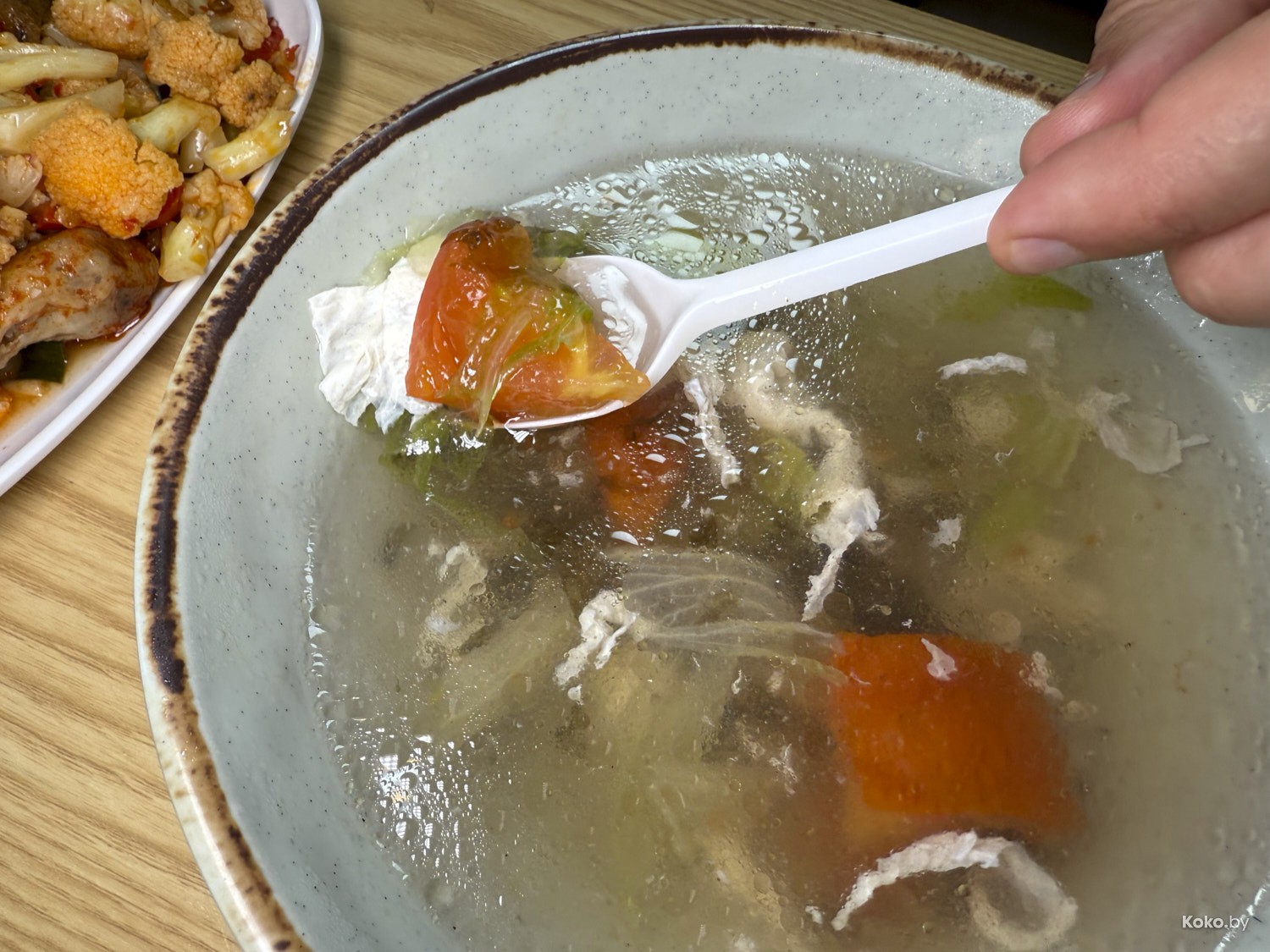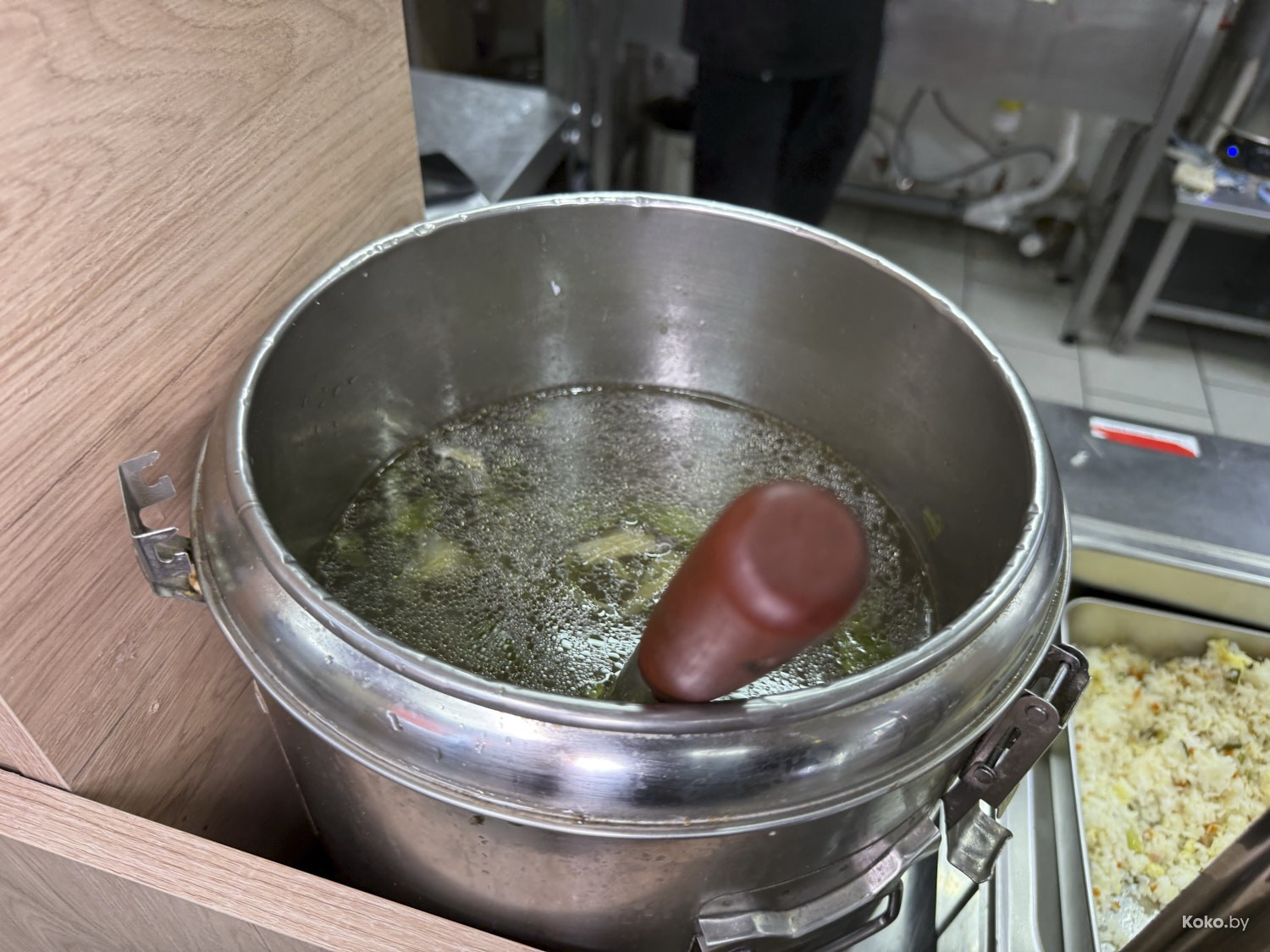 Суп предлагают есть пластмассовой ложкой для йогурта.