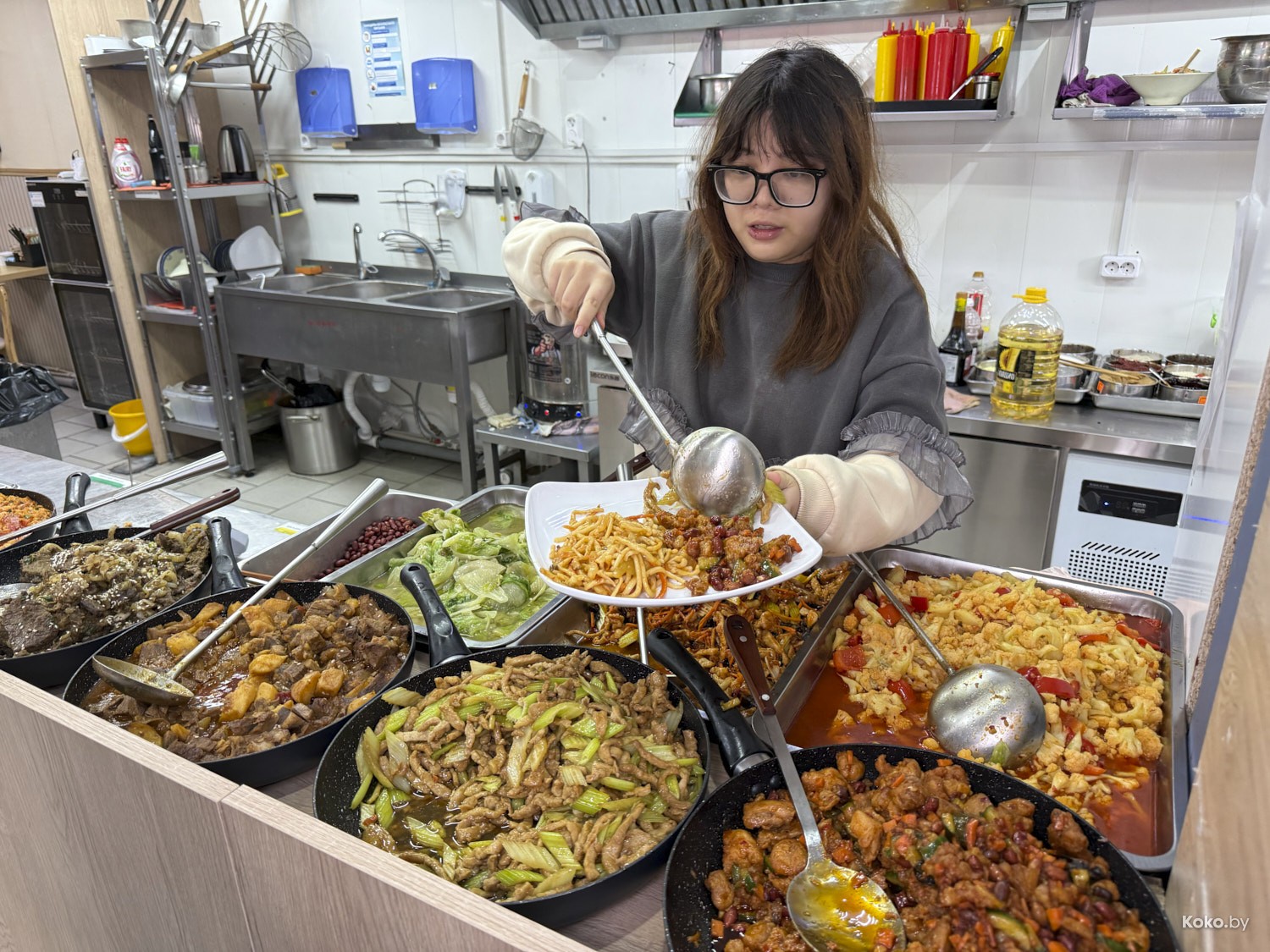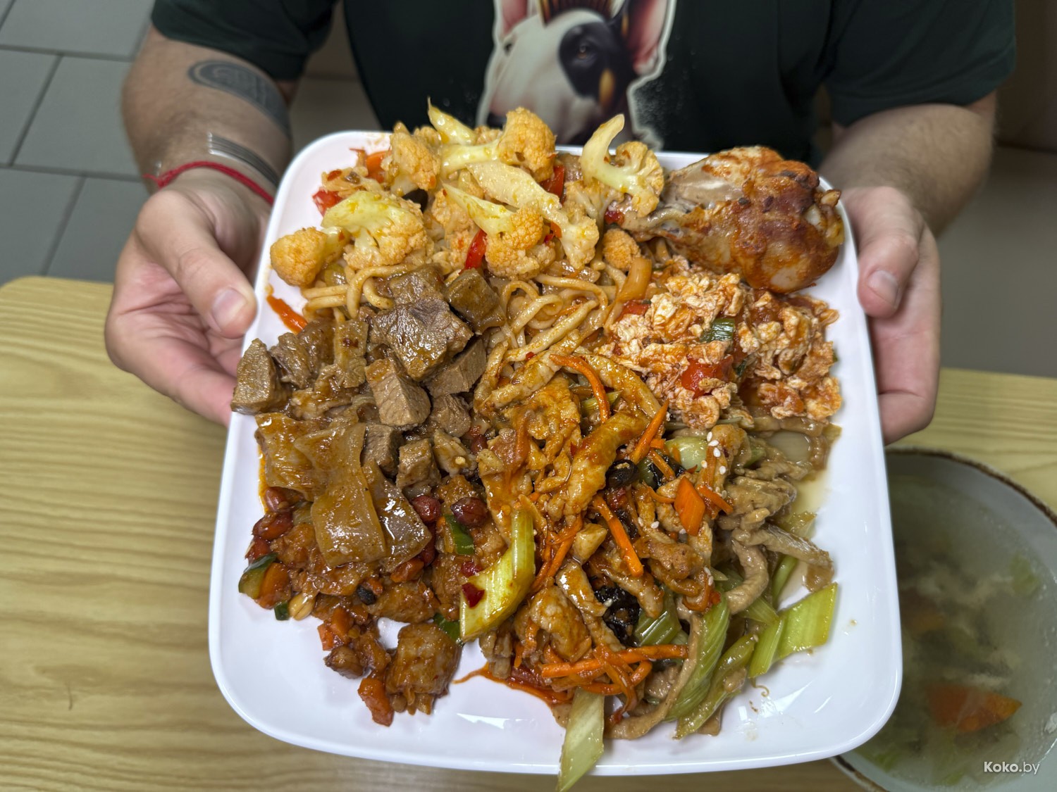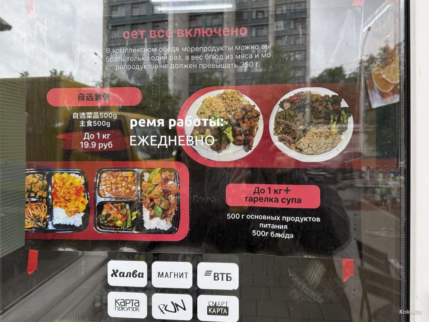 Первые 500г - это простые углеводы, выбираем отваренный рис или самодельную лапшу, другие 500г - разное мясо и овощи, хотя листовка на двери морепродуктами заманила. Отвечаю, в наших столовых еда выглядит презентабельней, выбираю их того, что выглядит съедобно.