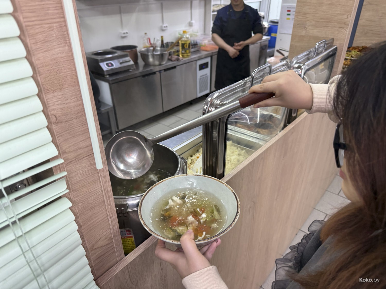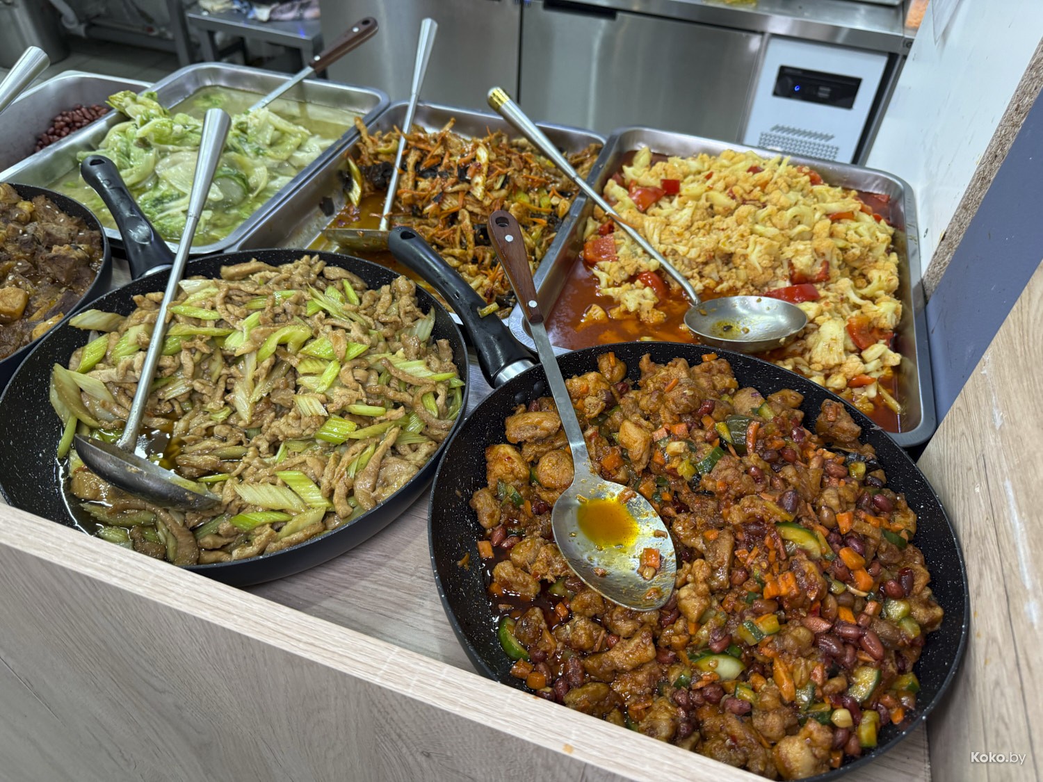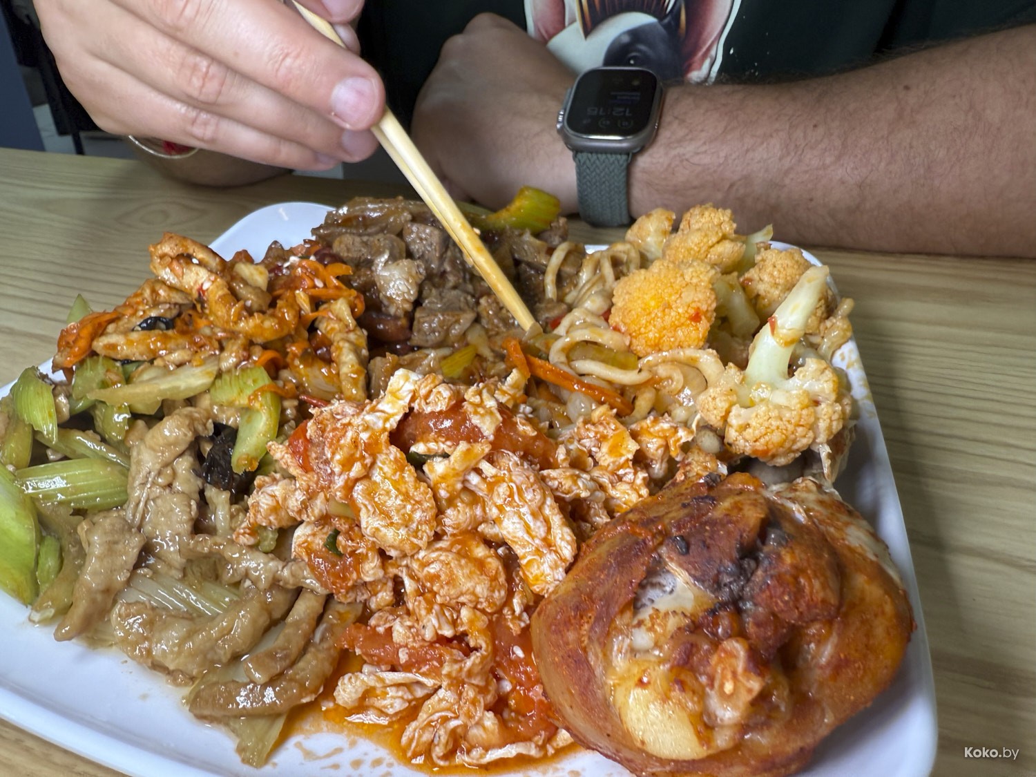 Первые 500г - это простые углеводы, выбираем отваренный рис или самодельную лапшу, другие 500г - разное мясо и овощи, хотя листовка на двери морепродуктами заманила. Отвечаю, в наших столовых еда выглядит презентабельней, выбираю их того, что выглядит съедобно.