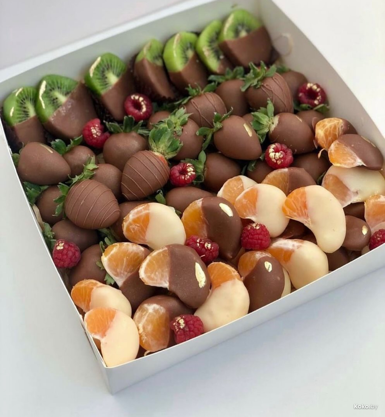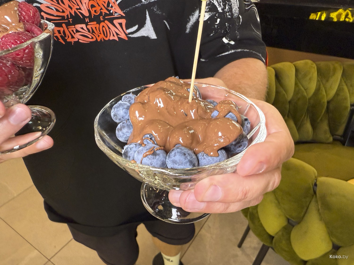 Поливать горячим шоколадом фрукты и ягоды прилюдно стало популярно после обзора на первую клубнично-шоколадную точку «Свити», где клубнику поливали с фонтана, как на фабрике Вилли Вонки. За ними идею подхватили шоколадники «Кэнди эплс», добавив к клубнике в дубайском шоколаде шарик мороженого, а пару дней назад в «Палаццо» развернули соко-бар с экзотическими фруктами «Фреш гарден», которые тоже обливают шоколадом.