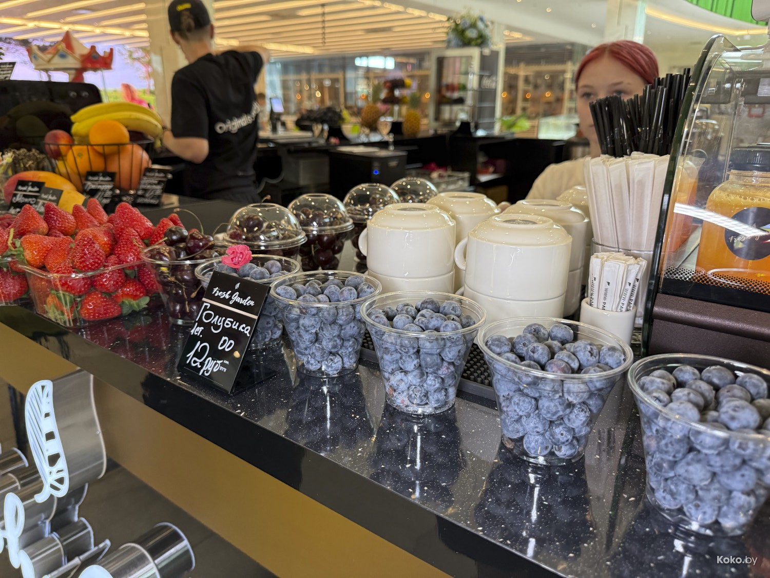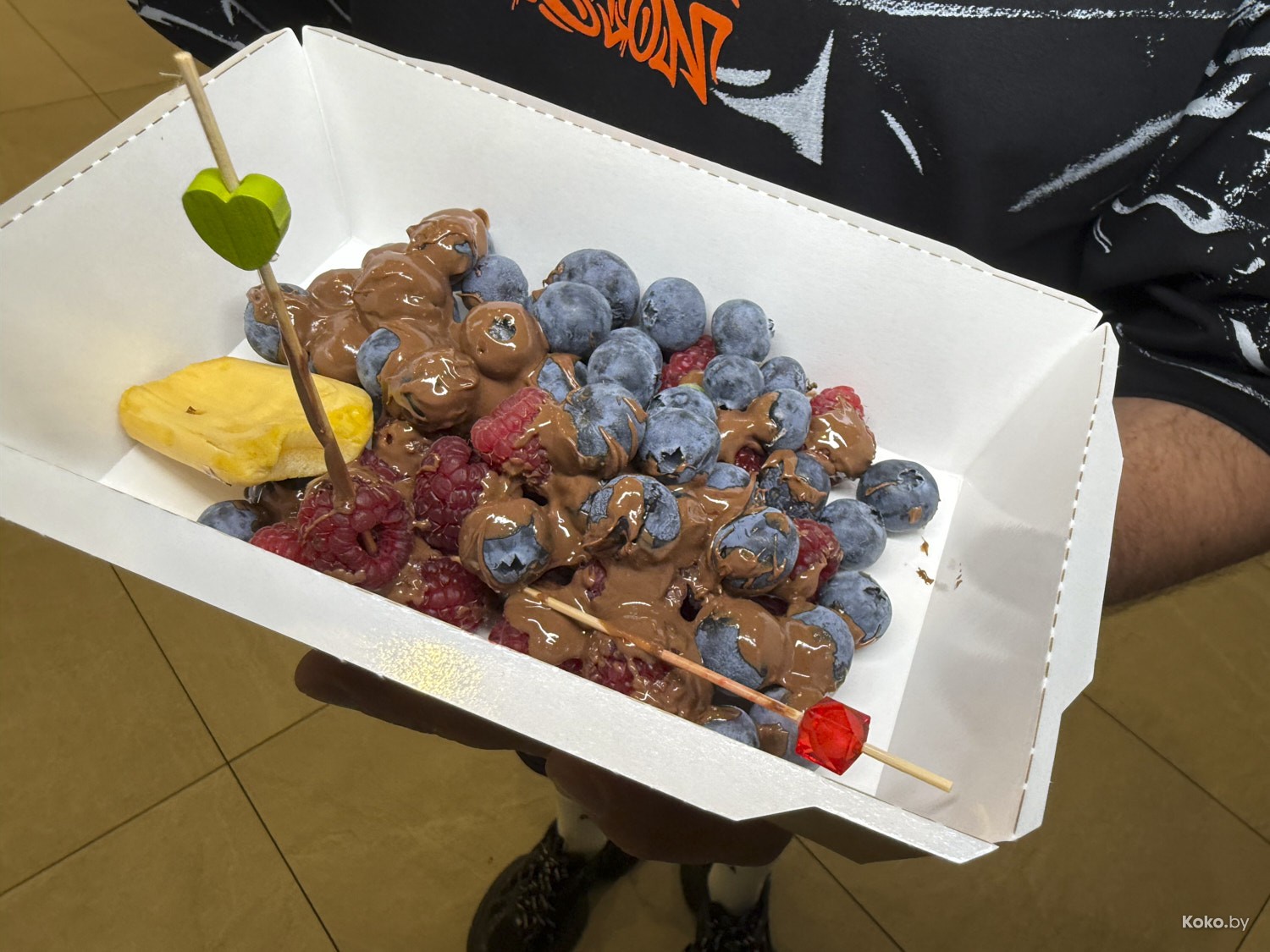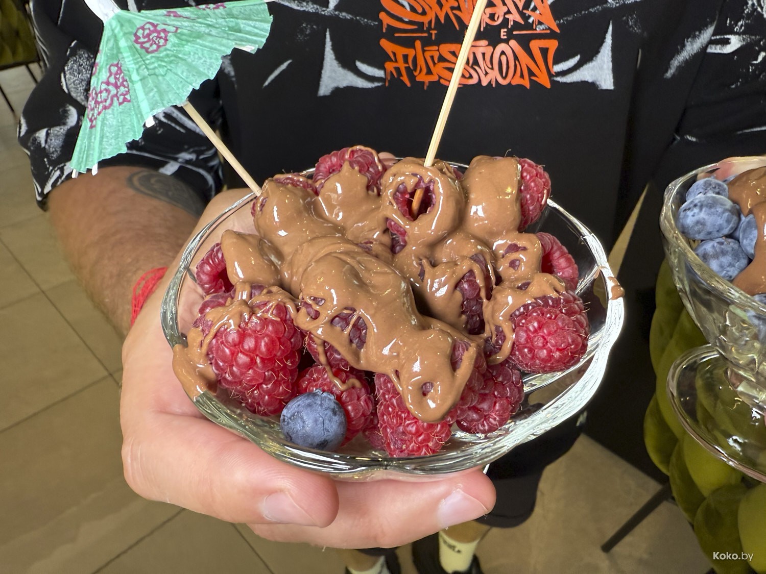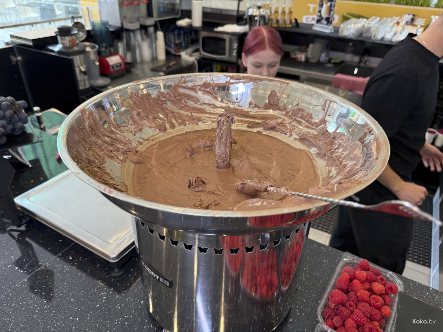 Фишка - экзотические фрукты, которые могут помыть на месте, сделать из них фреш или облить шоколадом. Шоколадный фонтан сегодня работать отказывается, поэтому пришлось сунуть в микроволновку.