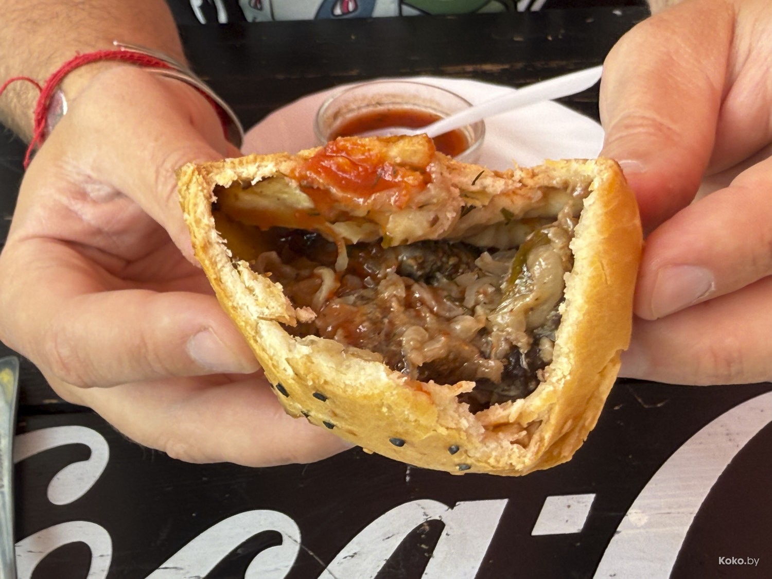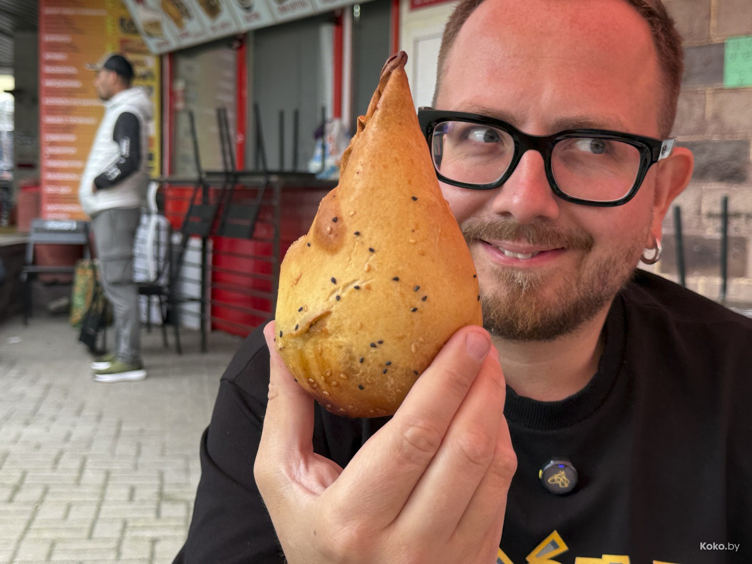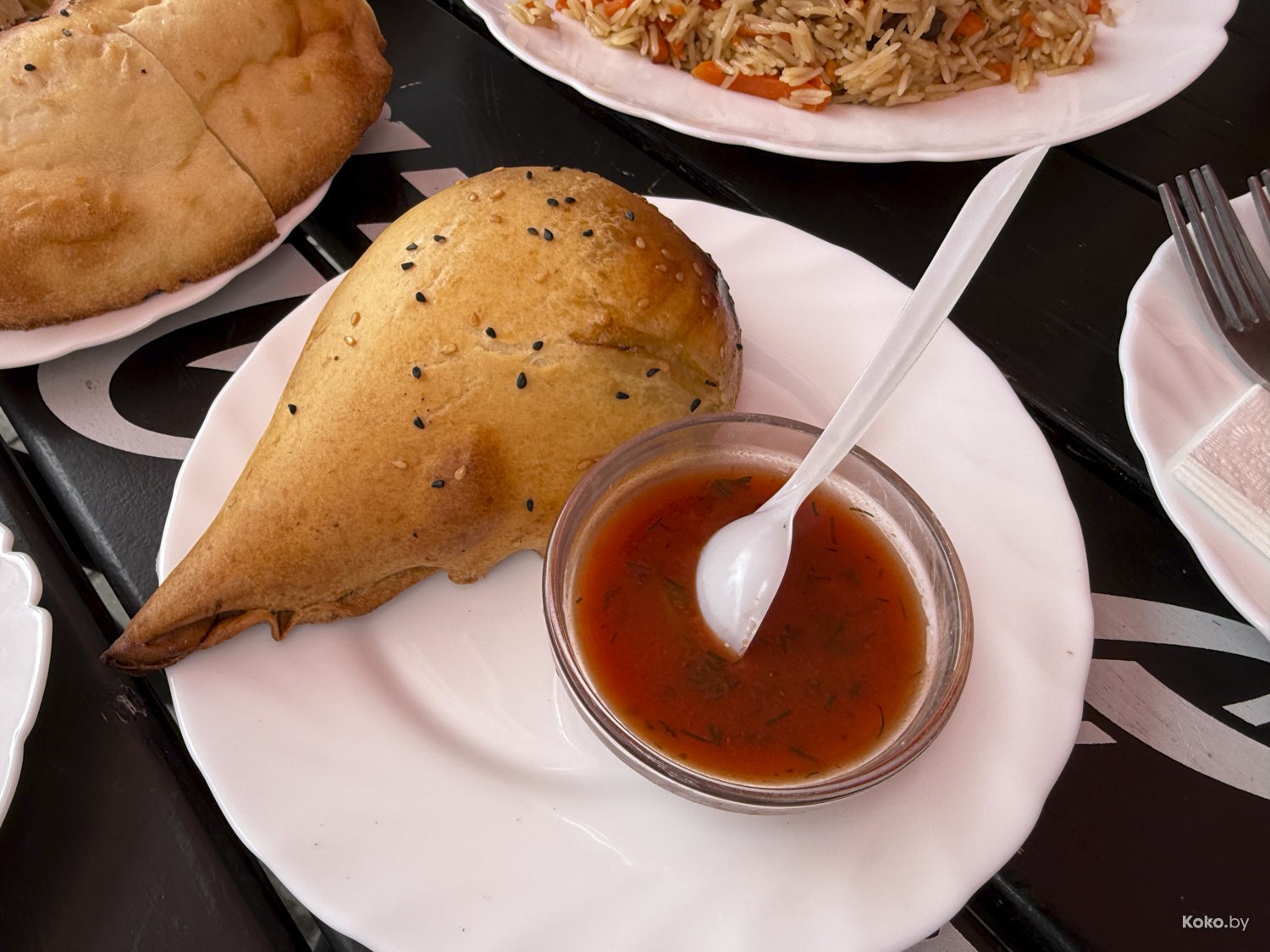 Твёрдое тесто, внутри порубленная с луком и жирком говядина, вкушать приказали с каплей пряного уксуса в жерло самсы. Топ, когда свежак.
