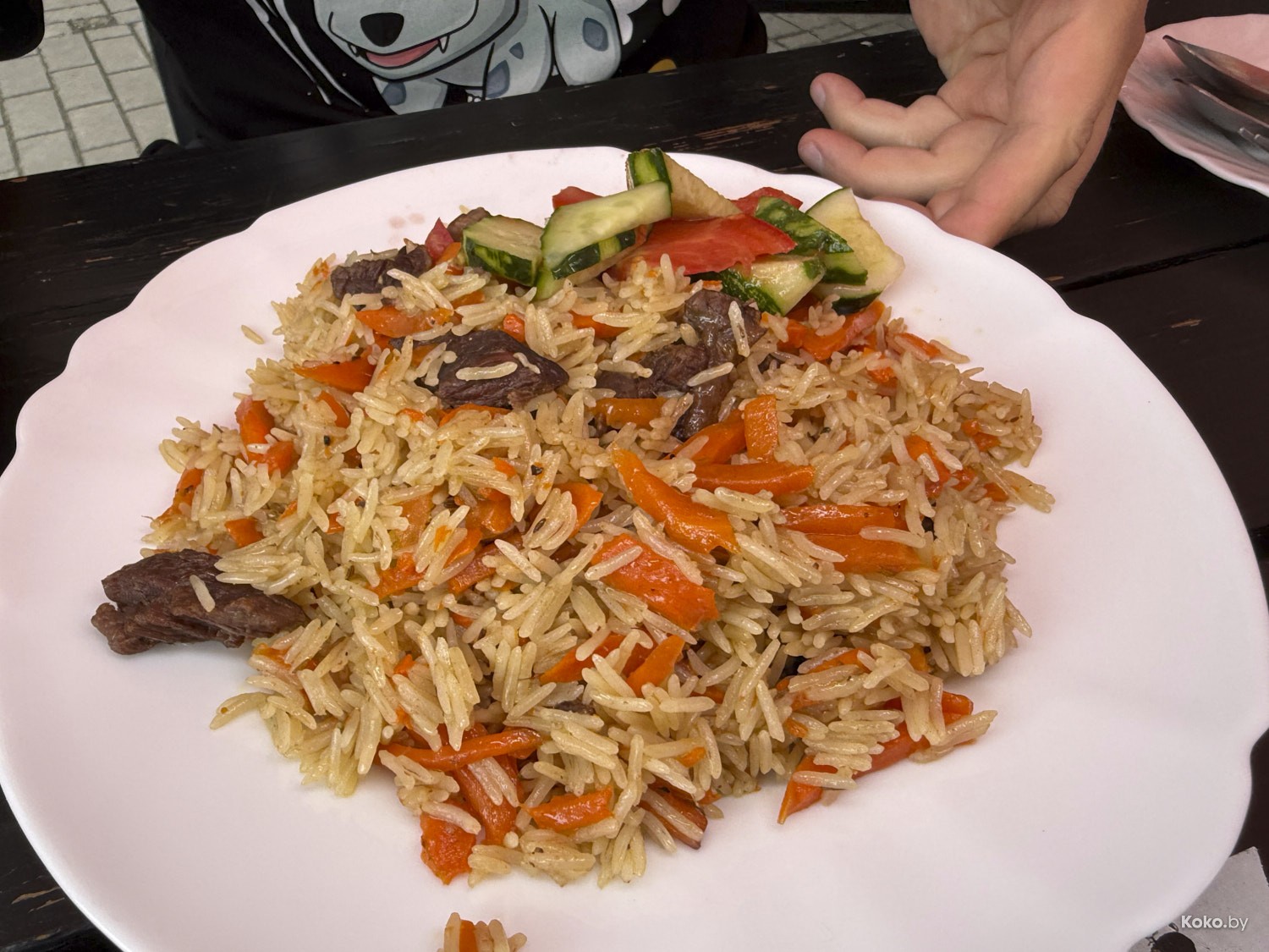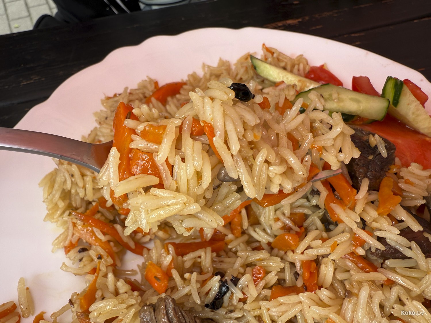1. Плов лёгкой степени аль денте, пряный, ароматный, умеренно жирный, с шестью кубиками мягкой говядины. За 8р крепкие 9 кокобаев.