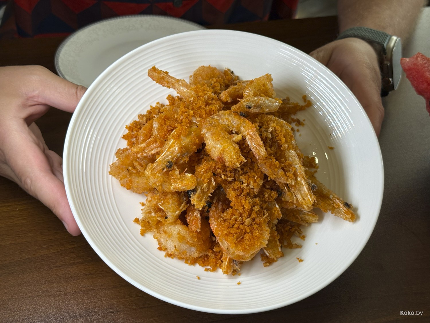 1. Стартанули с фирменных взрывных креветок в хрустящей панировке с головой и хвостом, принято закидывать в рот целиком, как чипсы.