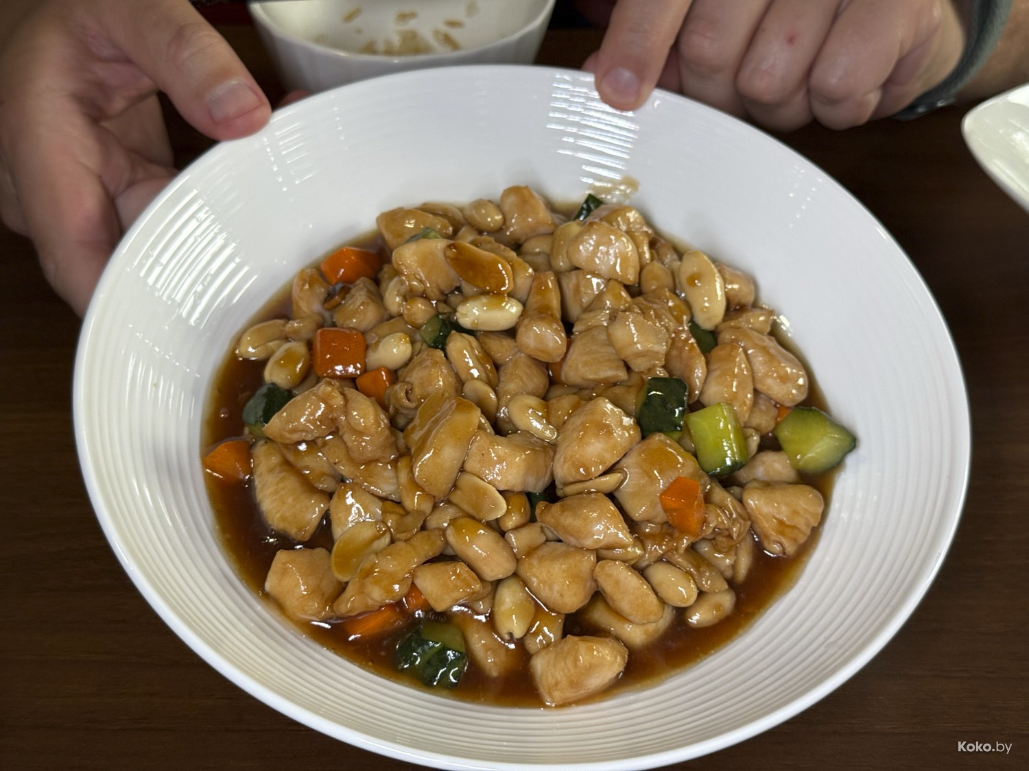 На сегодня оно на русско-китайском в заметках Ворда, на неделе обещают общественное меню. Просим официанта дать совет, что брать из их фирменного, понятно вообще ничего, но мы соглашаемся, из узнаваемого просим пожарить в липком соусе цыплёнка Гун Бао.