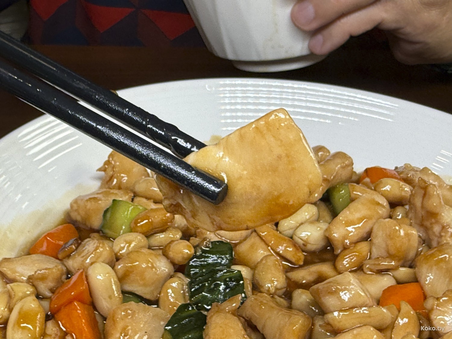 5. Нежнейшая курица ровными кубиками в сладко-липком соусе с жареным арахисом, огурцом и морковкой - это вкуснейшее Гун Бао с нулевой остротой. Из острого сегодня лишь Димона шутки.