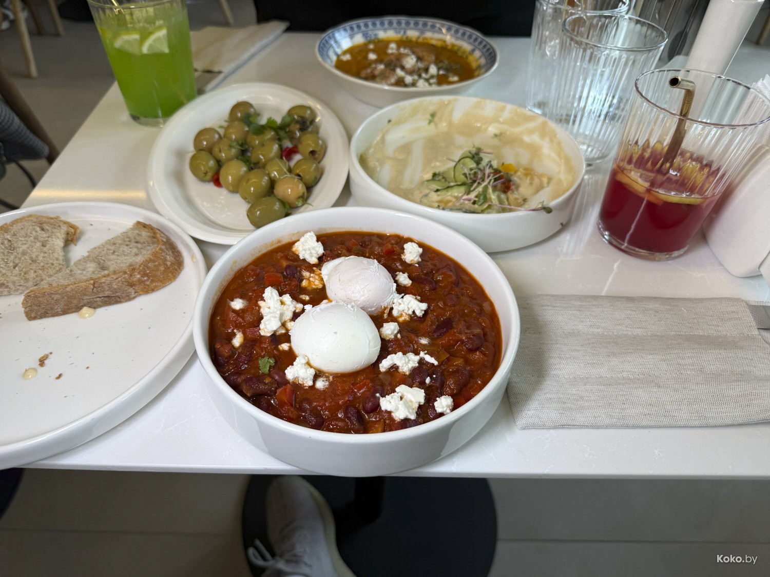 3. Их Тель-Авивское утро за 24р - это шакшука с зачем тут фасоль и крошкой сыра Фета, подают с тарелкой свежего хлеба.