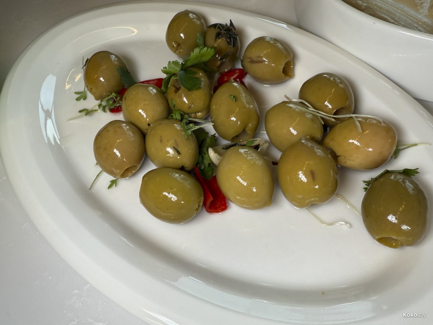 2. Ладья тигровых оливок в не успевшем маринаде с чесноком, кинзой и чили - 15р. Им бы чутка настояться в собственном маринаде, а для яркости прибавить уксусной винности, как маринуют в «Нола».