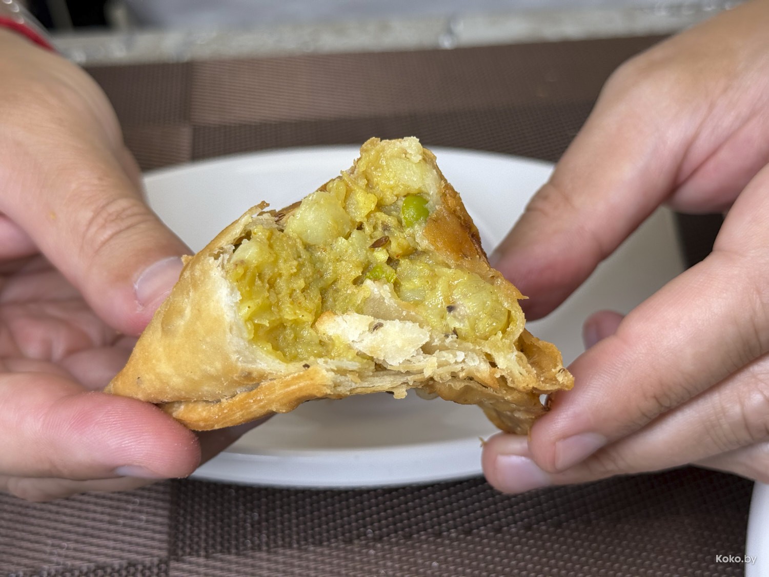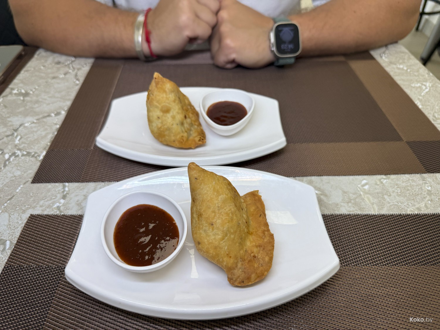 Самое быстрое из всего заказа - это пирожки самса с пюре и горохом в качестве бесплатного угощения, макайте в сладкий соус.