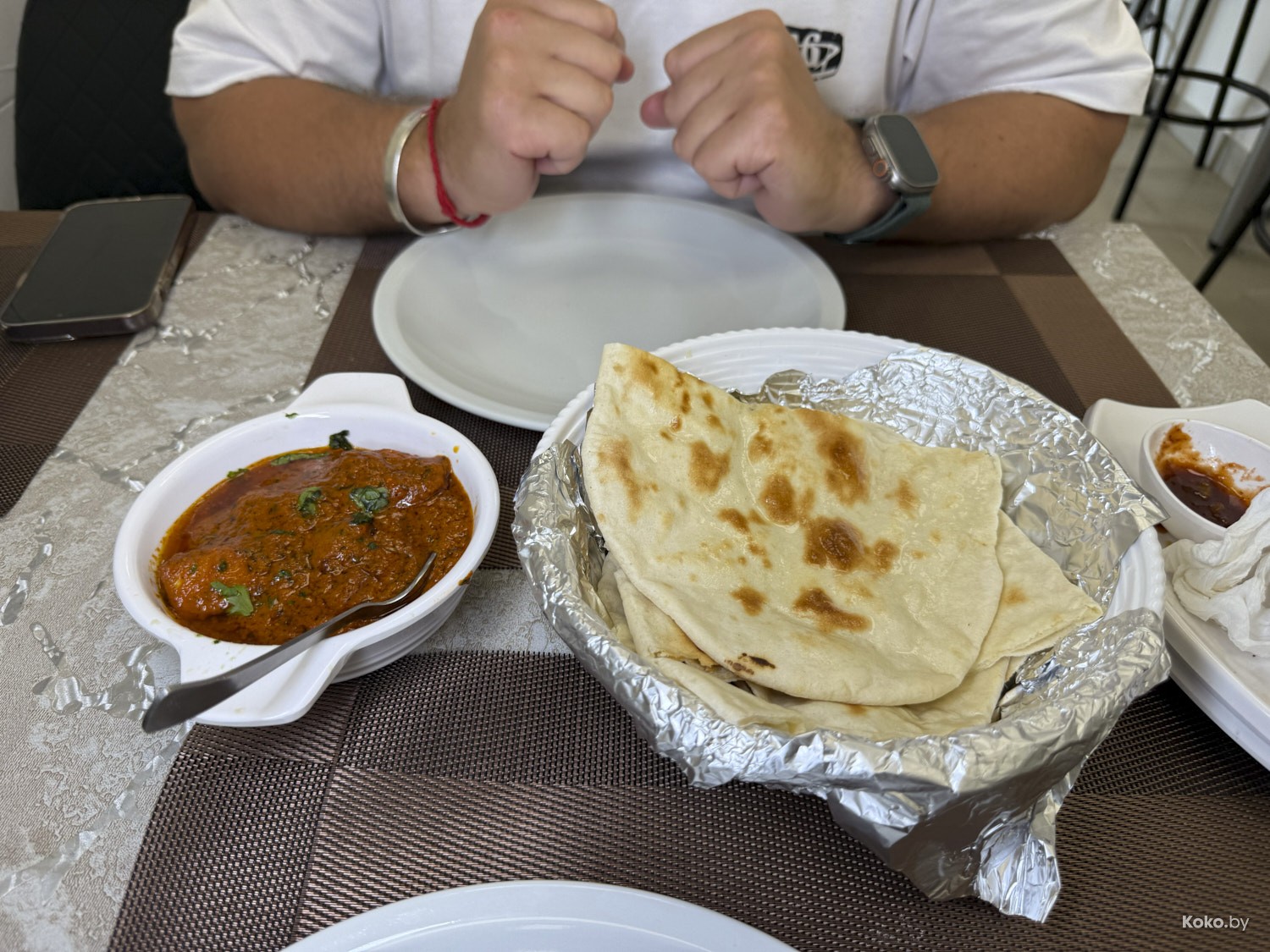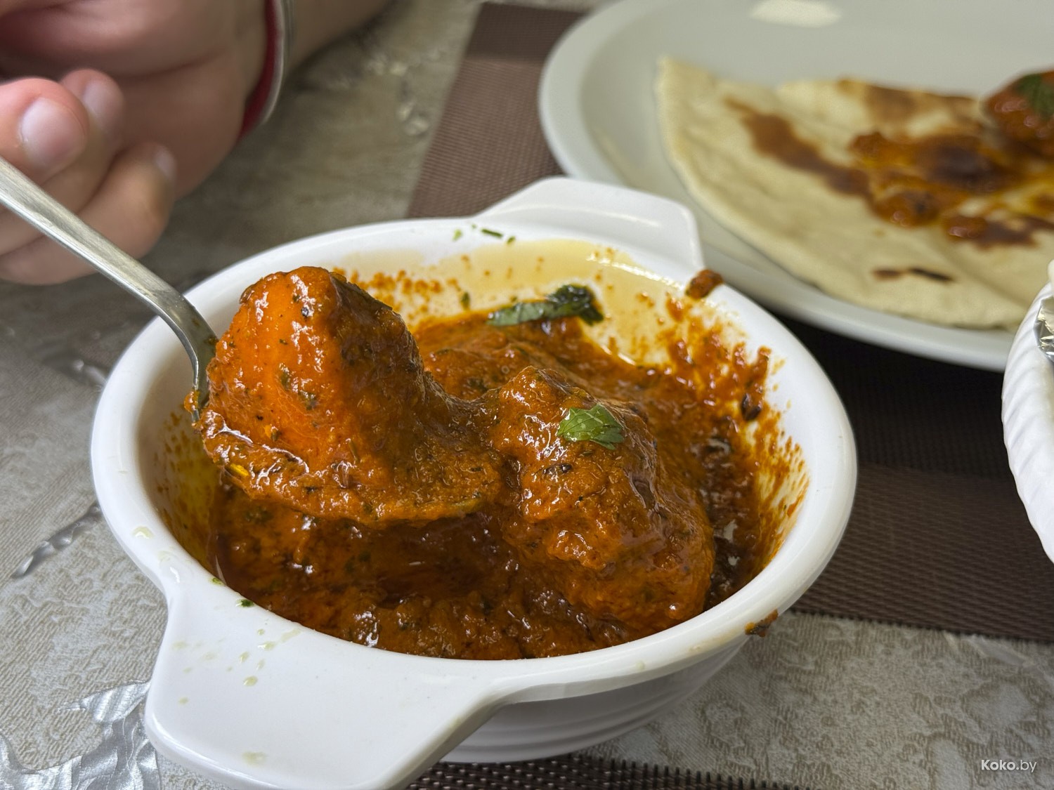 Острота на 3 из 10, душистый соус, в котором плавает 4 кусочка курицы с какой-то магией, он такой вкусный, что лепёшкой тарелку вытерли.