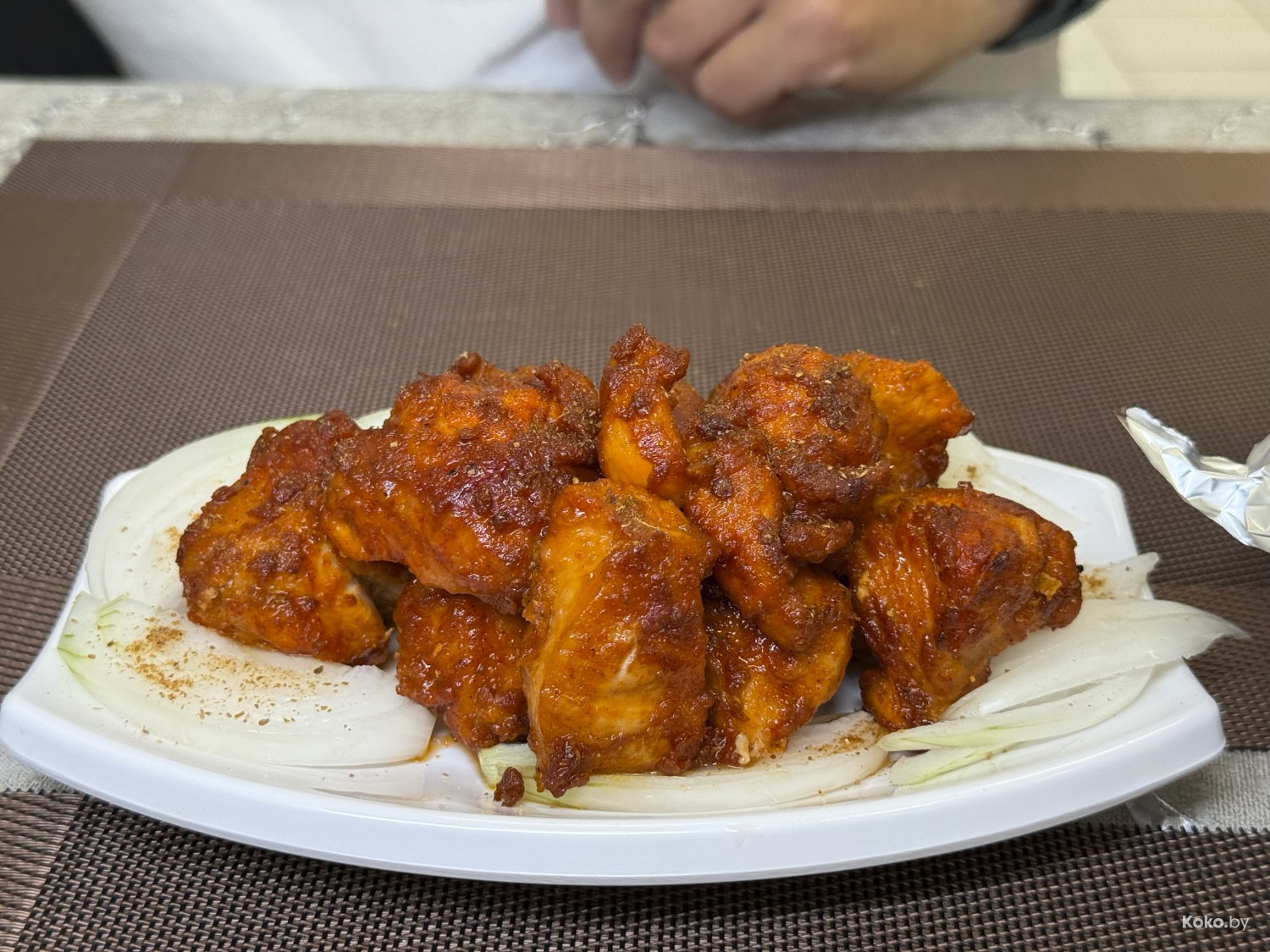 2. Собирался уже потиху ретироваться, но минут через тридцать на столе появилась курица типа шашлык, выложили её на свежий лук.