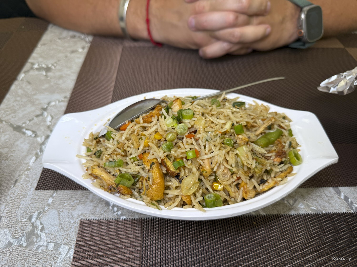 3. Чуть оперативней, минут через пятнадцать, на столе на сухую жареный индийский рис с овощами и курицей, у риса яркий вкус огня, такой эффект можно получить, лишь умея жарить на воке. Вкусно с карри.