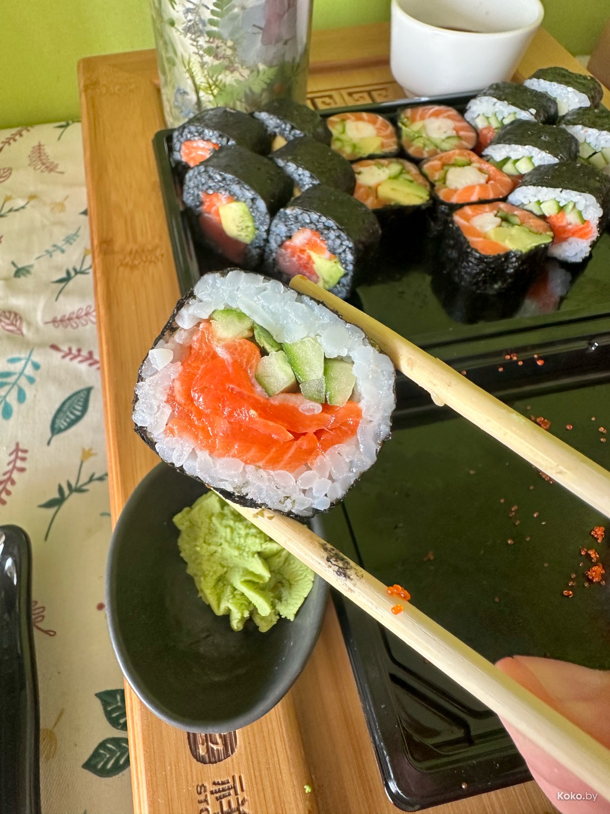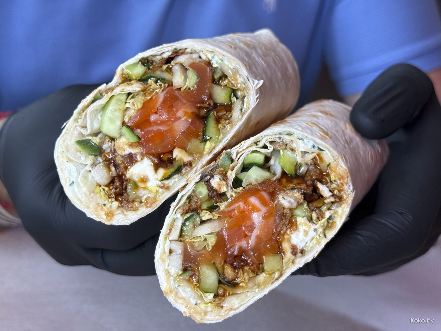 1. Лосось с овощами и сыром фета в сладко-липком соусе терияки больше ролл, чем шаурма. Цвет рыбы здоровый, порция, как в ролле Калифорния за 18р у «Марлина», скрутили туго в хрустящий лаваш, с соусами баланс, не течёт, не брызжет, в руках в букет не превратилась.