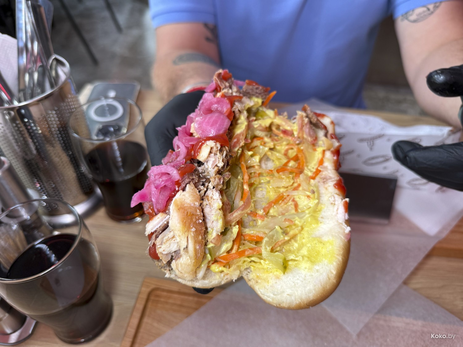 3. Классический с индюшиной сосиской температуры собачьего носа зашёл, как утки в речку. Пышная булочка внутри, упругий сосисон бодро залит разными соусами, как и положено хот-догу - база.
