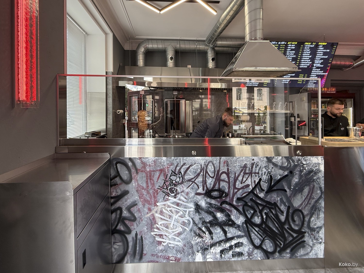 Открытая кухня, на которой ничего не утаишь и палец в нос не засунешь, пара столов со стульями и общая летка с лавочками на пешеходной Комсомольской. Согласитесь, удобней есть за столом с салфетками.
