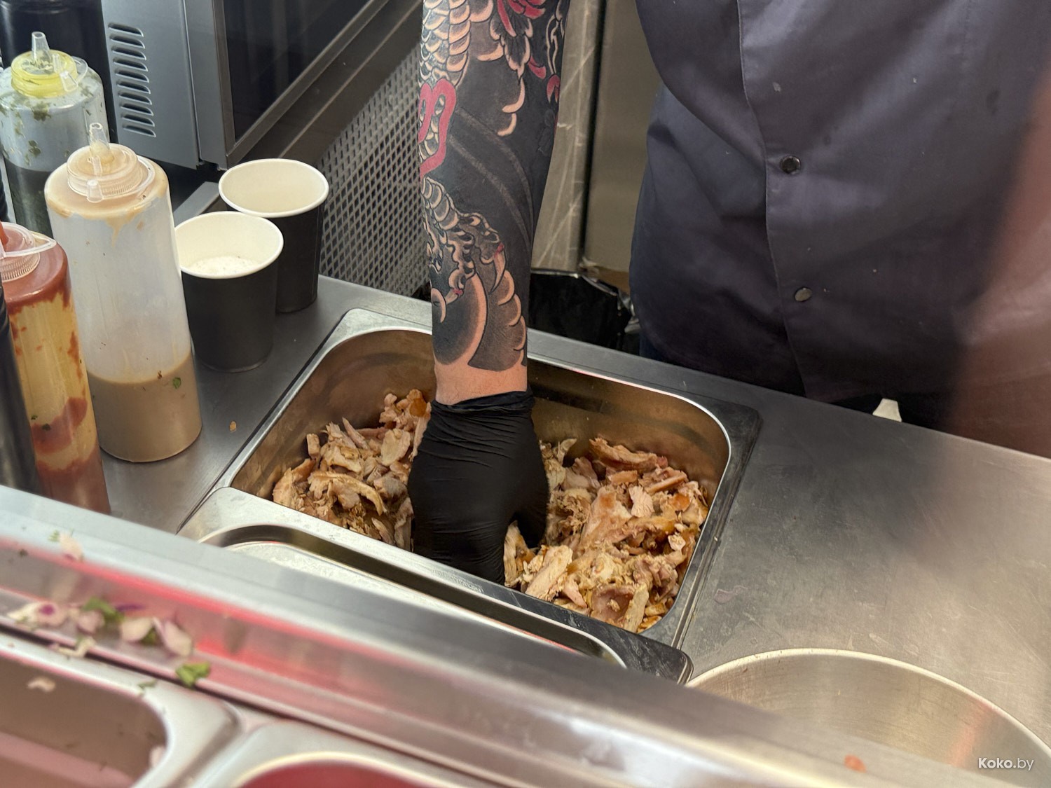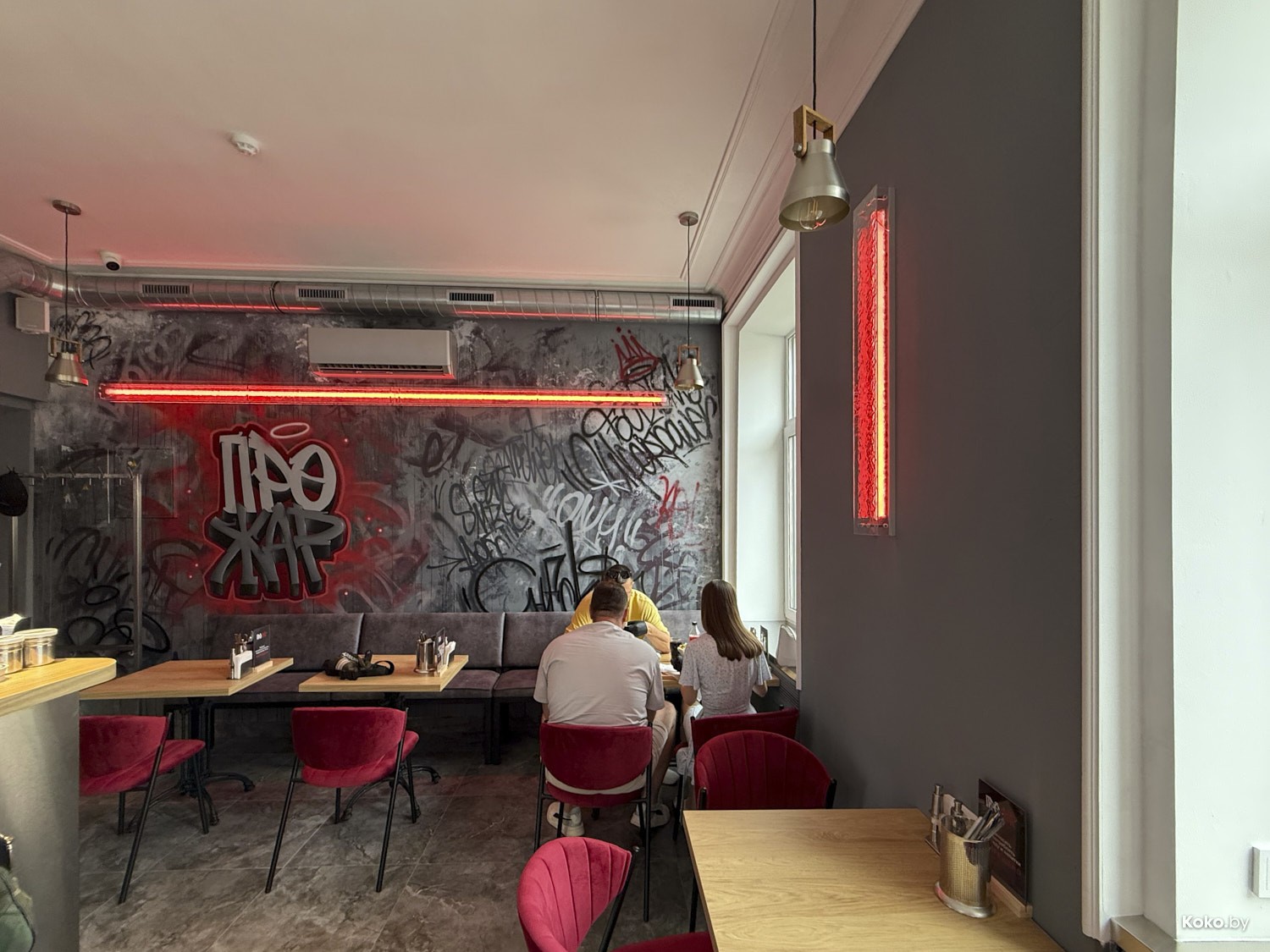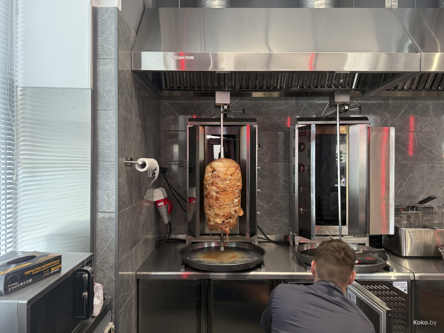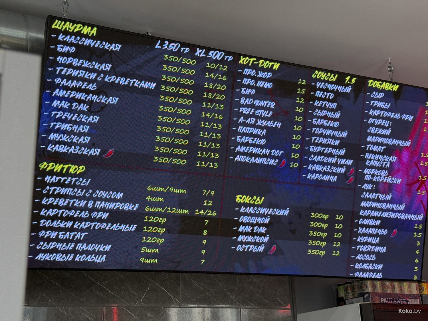 Когда кажется, ну сколько можно, хватит, стоп, остановитесь, открывается очередное заведение с шаурмой и хот-догами прямо на углу Комсомольской. На открытой кухне нового «Прожар» в чёрных латексных перчатках собирают в хот-дожные булочки разные начинки и крутят-вертят шаурму, которую по рецептуре обязательно разрезают пополам. Да, один в один, как в «Шаурма в пиве» - шаву на две части на поднос, и держи перчатки, чтобы по-культурному, с уважением.