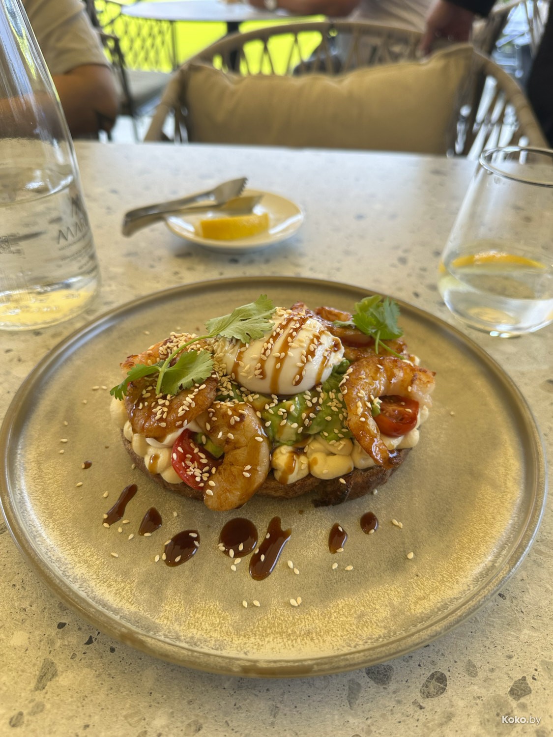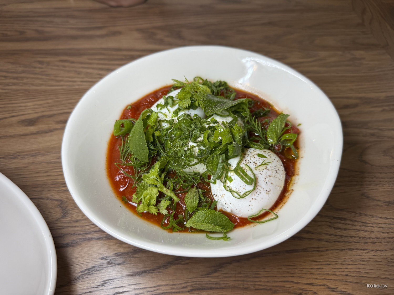 1. За крепкие 23р ленивая шакшука с дабл яйцами пашот под четырьмя видами зелени, правильным куском хлеба и горстью маслин.