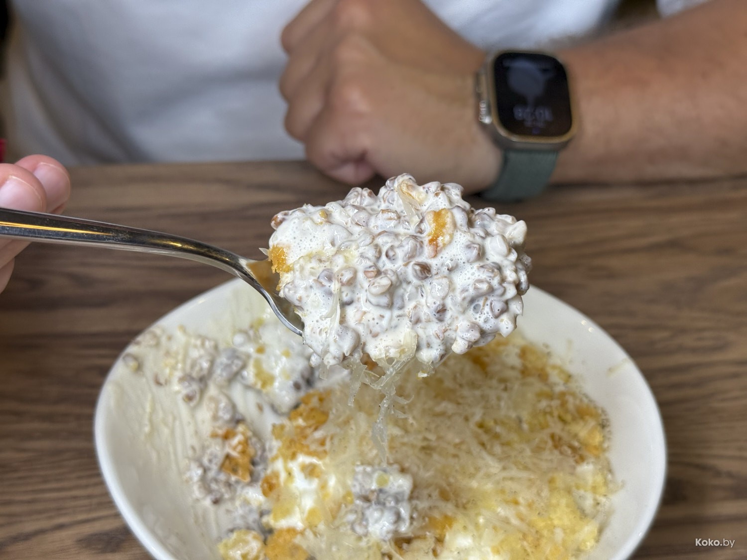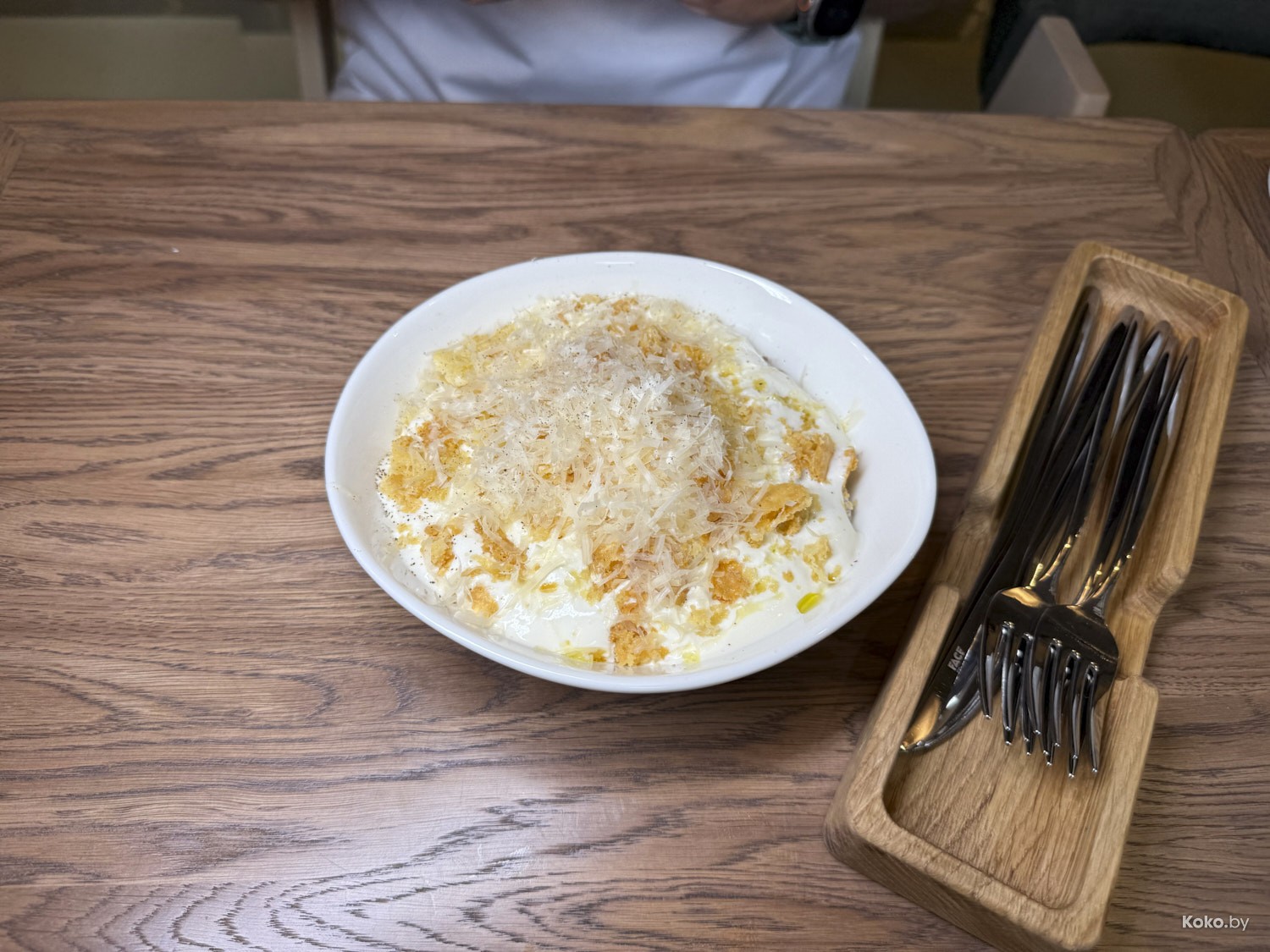 2. Гречка на сливках под сырным муссом с сырными печеньками и очищенным руками главного повара яйцом всмятку - 18р.