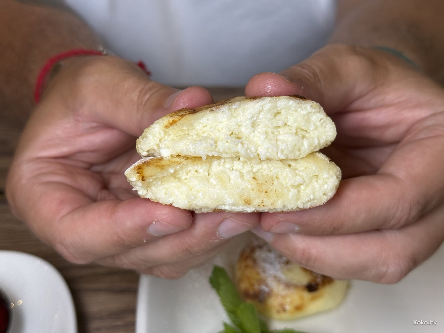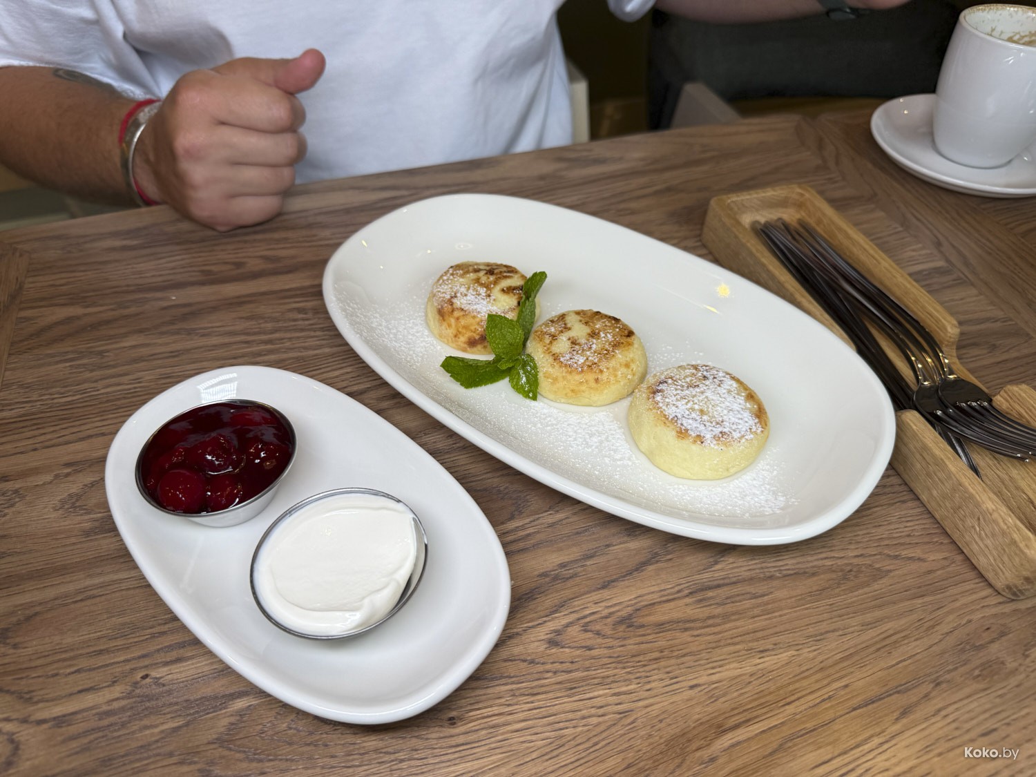 3. Три пышные творожные шайбы со сметаной и вишнёвым компоте за 16р - просто качественные сырники, как бабуля жарила в деревне.