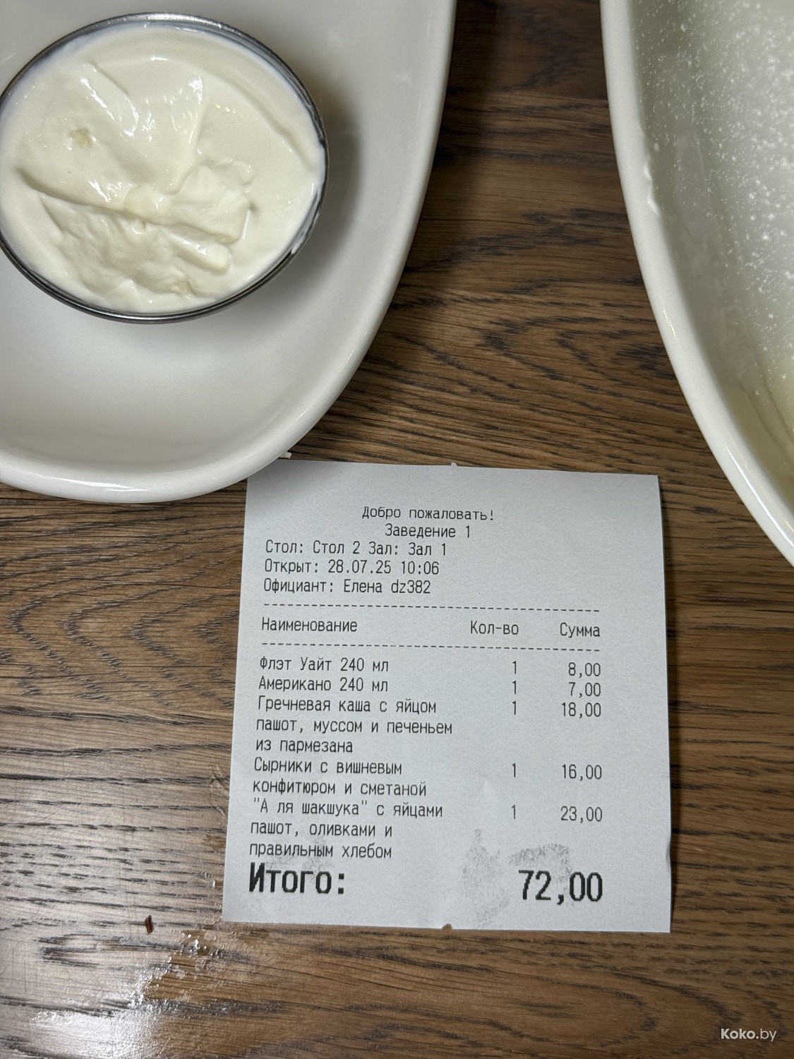 Яйца, сырники, мятый картофель, кофе и винишко. Средний чек на глаз под 40р, если не саблировать Мумм и не запрокидывать за воротник.