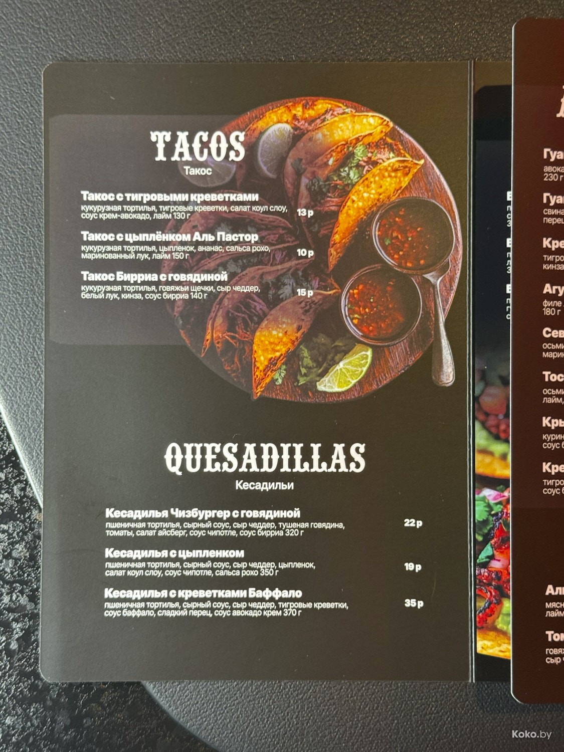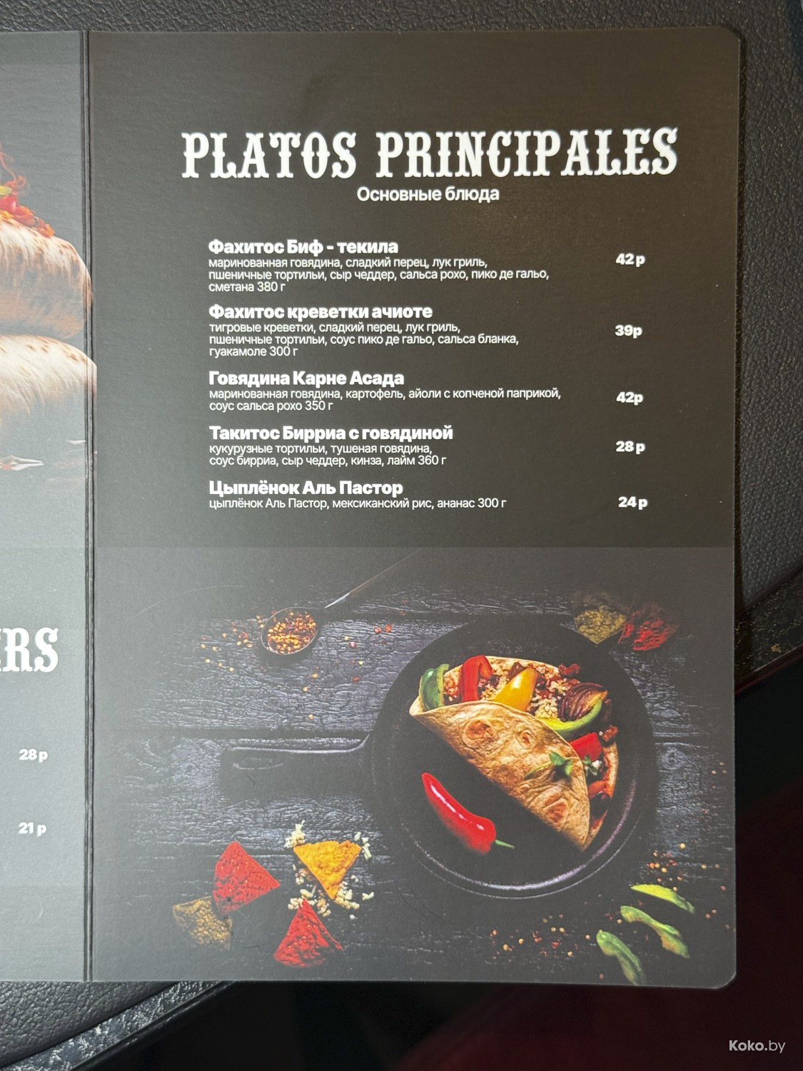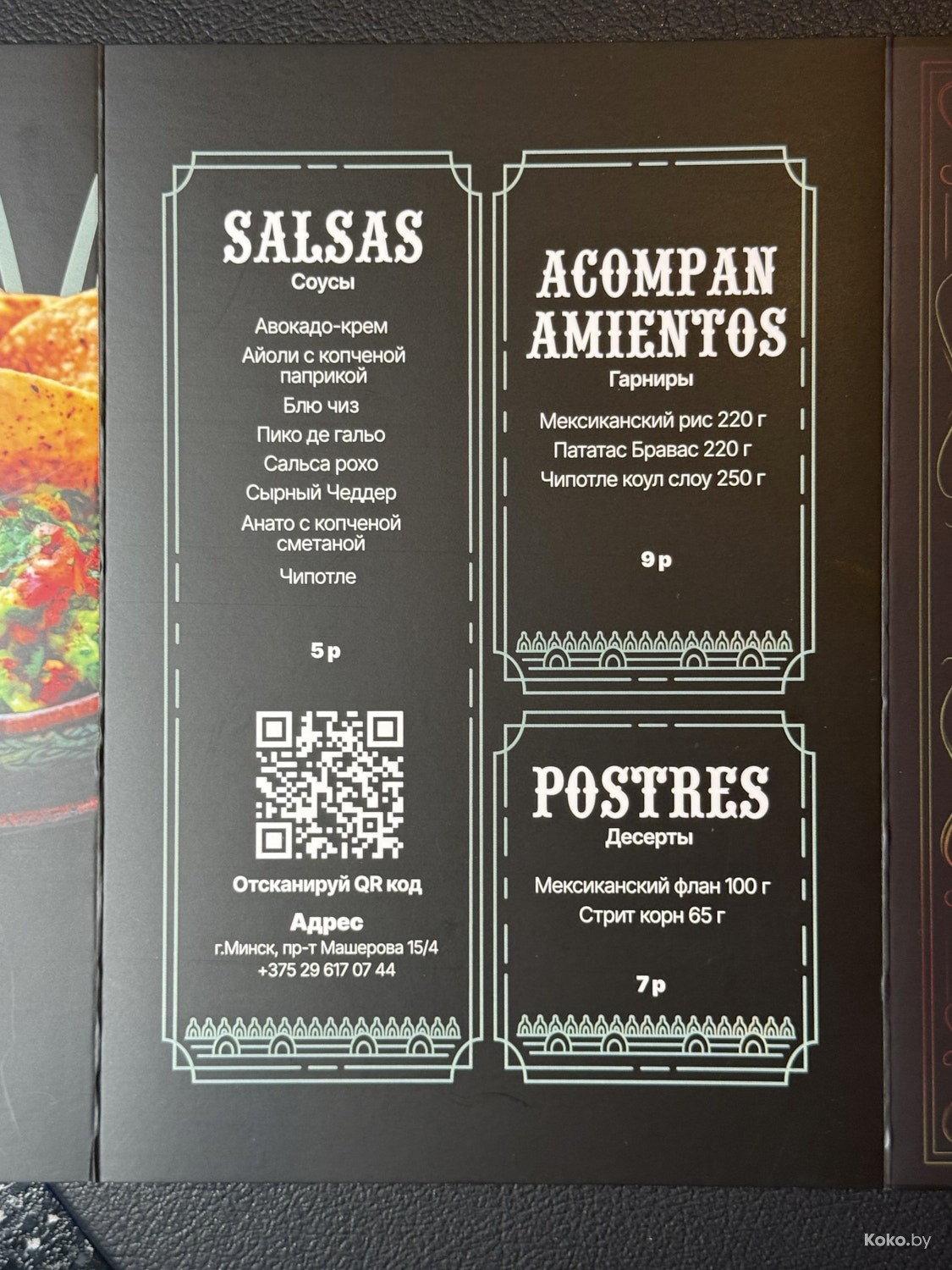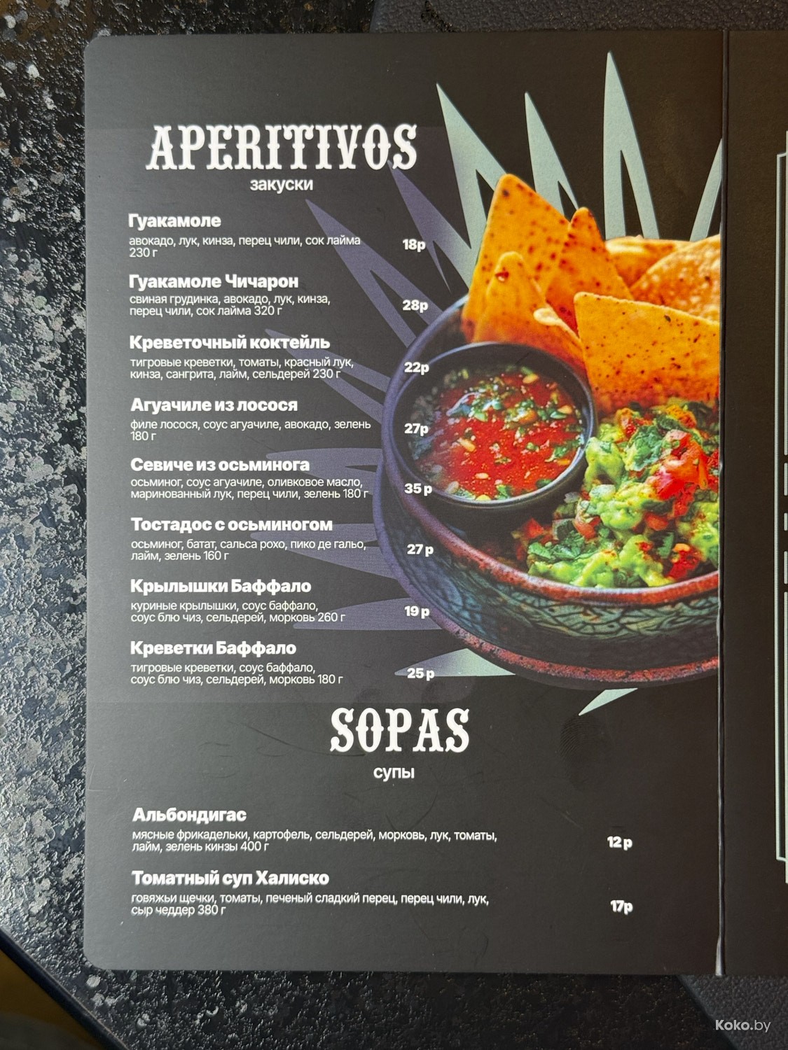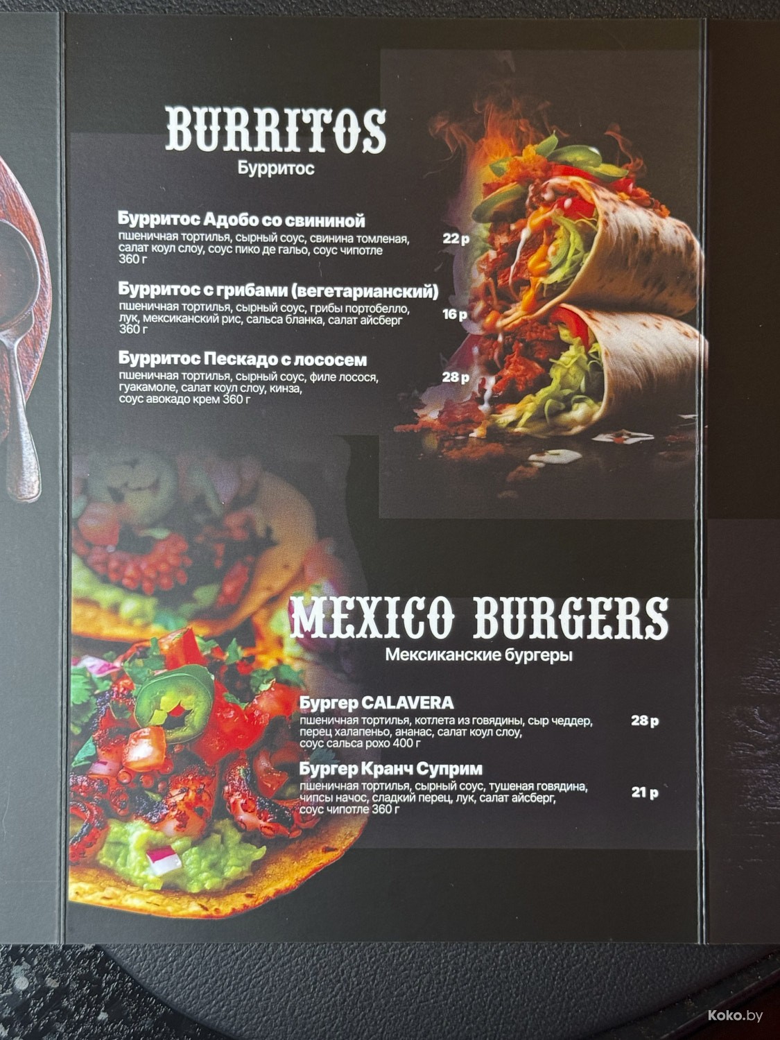 В меню всё, что дала природа Мексики в границах Беларуси, цены на еду вменяемые. Сейчас посчитаем в рублях, сколько стоит поесть и запить пятерым голодным, до тако уставшим странникам.
