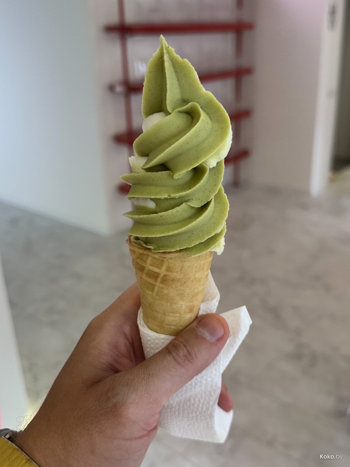1. Фирменное мороженое за 5р с минимальной жирностью, зелёную часть не распознал, не то фисташка, не то матча, вкуса у неё нет.