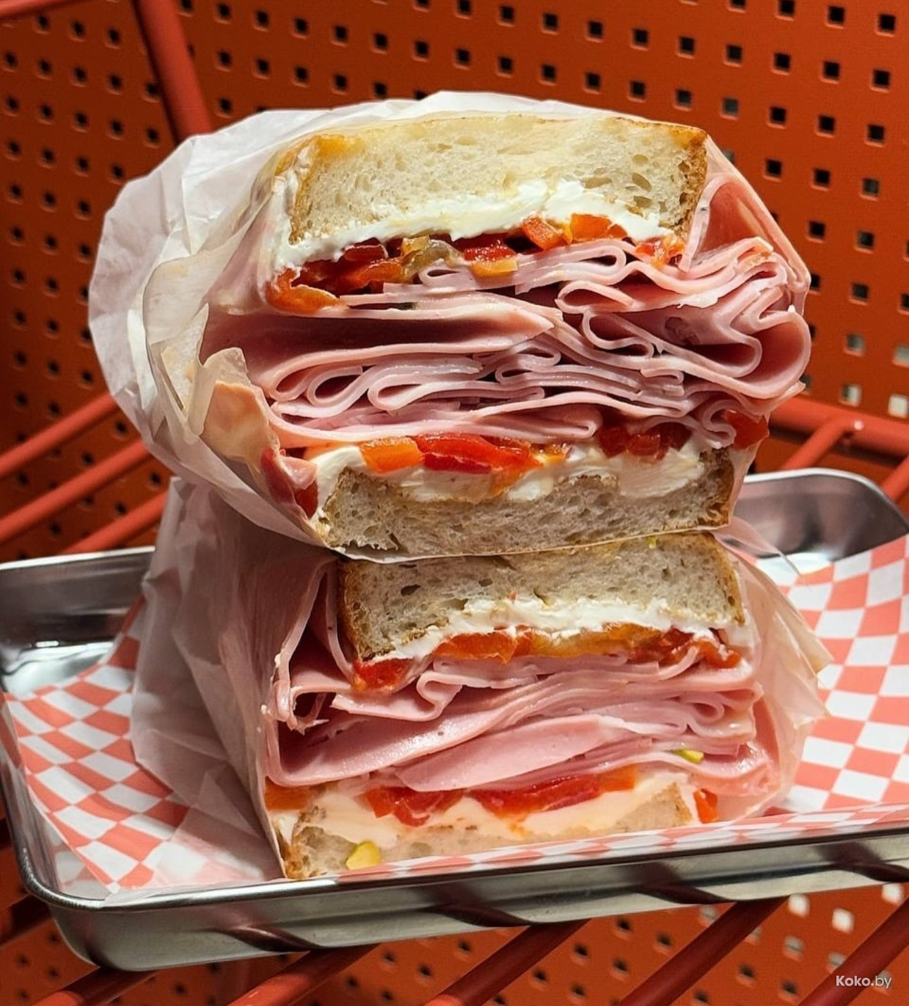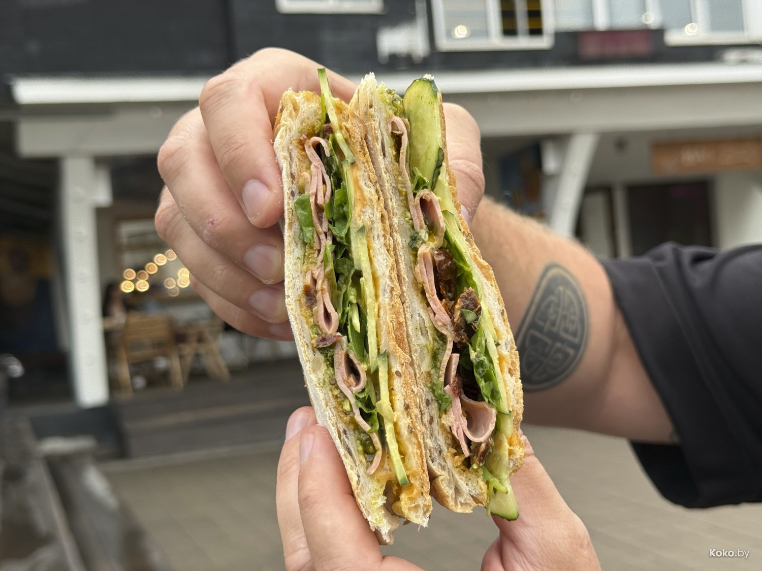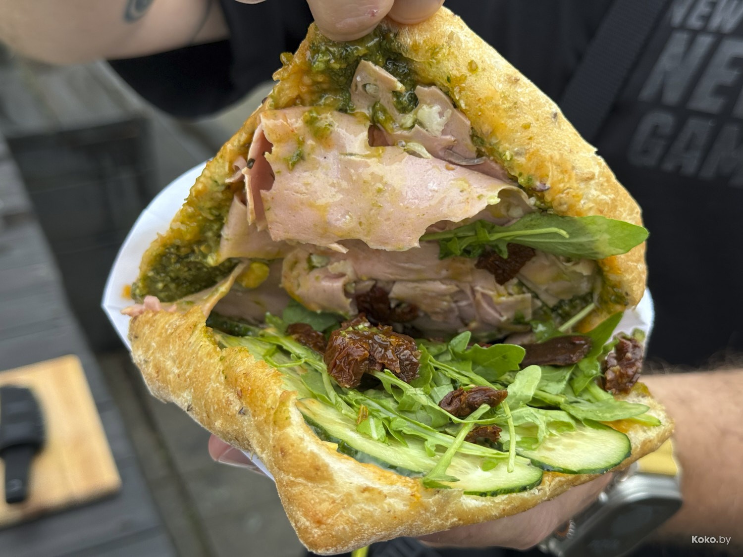 Сытно, потому что не жалеют хлеба, интересно по начинкам, мне вкусно на светлом хлебе мортаделла с сыром под песто и буженина с маринованным огурцом и соусом из хрена по-сяброуски. Цены на грани!