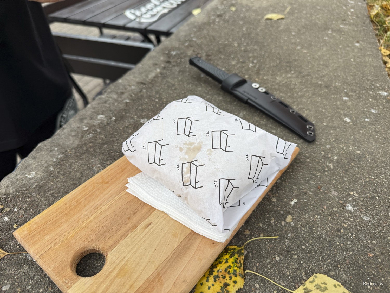 Выдают из окна в горячем виде внутри пергаментного пакета, который не даст соврать, насколько жирный сэндвич, аж просвечивается.