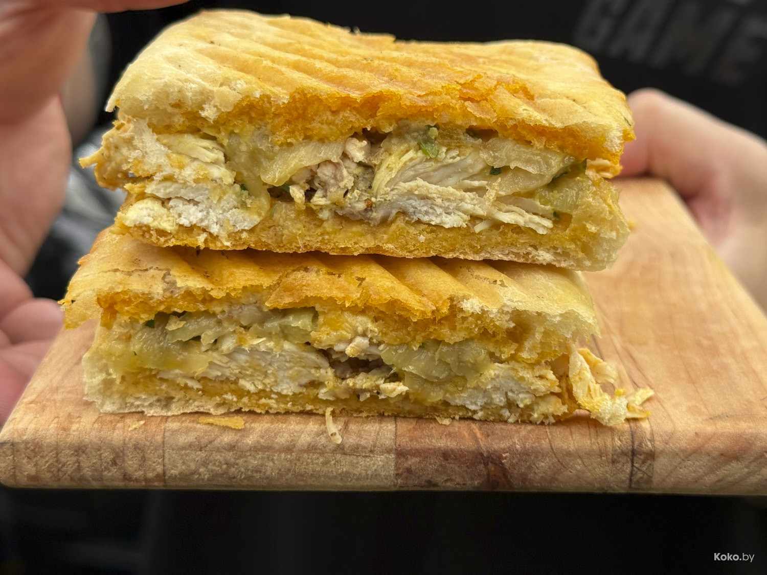 Плоский сэндвич за 11,40р, как сам себе дома собрал. Под тостовым хлебом куриные филе, сыр, самодельный соус песто, на 7 кокобаев.
