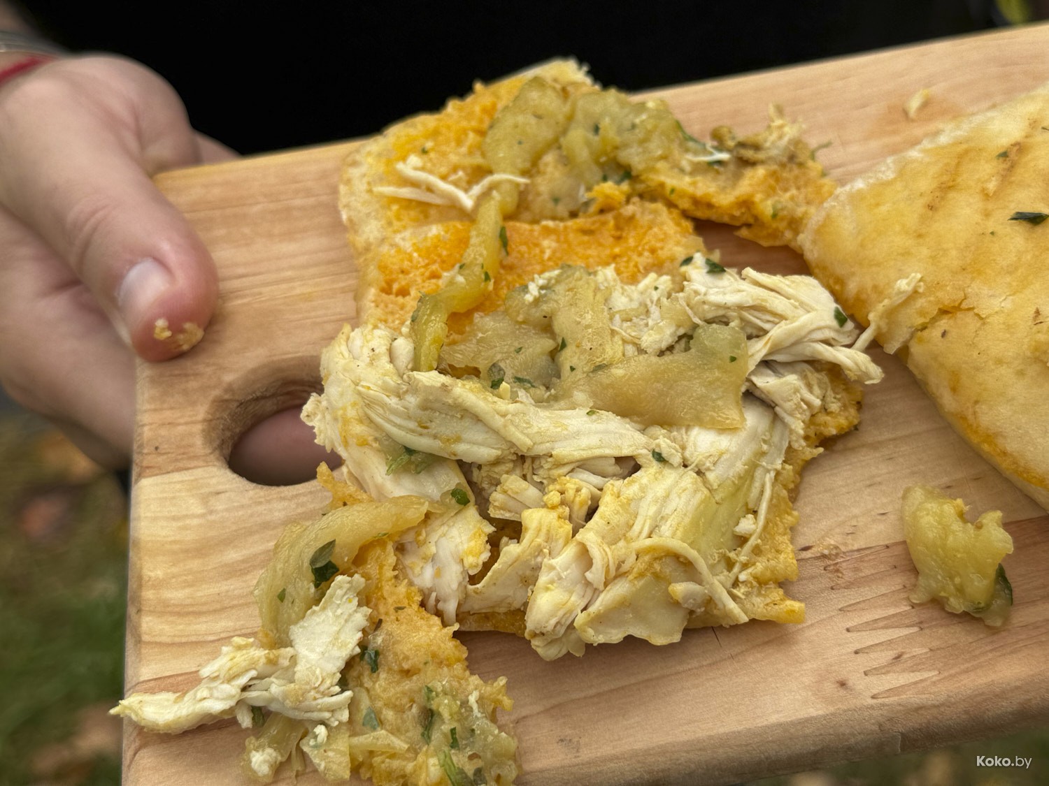 За 12р между хлебов поместили много рваной курицы гриль с чем-то непонятным, вроде зелёный перец. Биотопливо на 7 кокобаев.